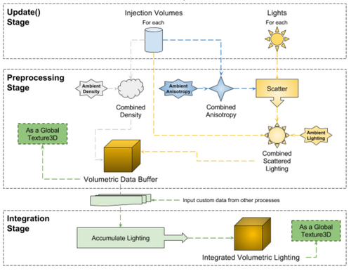 本文深入解析了Unity的开源插件Aura,详细介绍了其如何实现体积光和体积雾等大气效果。通过分析Aura的计算流程,包括光源和体积数据结构处理、深度信息计算、体素计算、光照计算、累加过程以及最终的图像合成,揭示了Aura大气效果背后的原理。