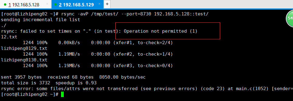 [root@lizhipeng02 ~]# rsync -avLP 192.168.5.128::test/ /tmp/test/ 机器2同步出错,因为端口号不对