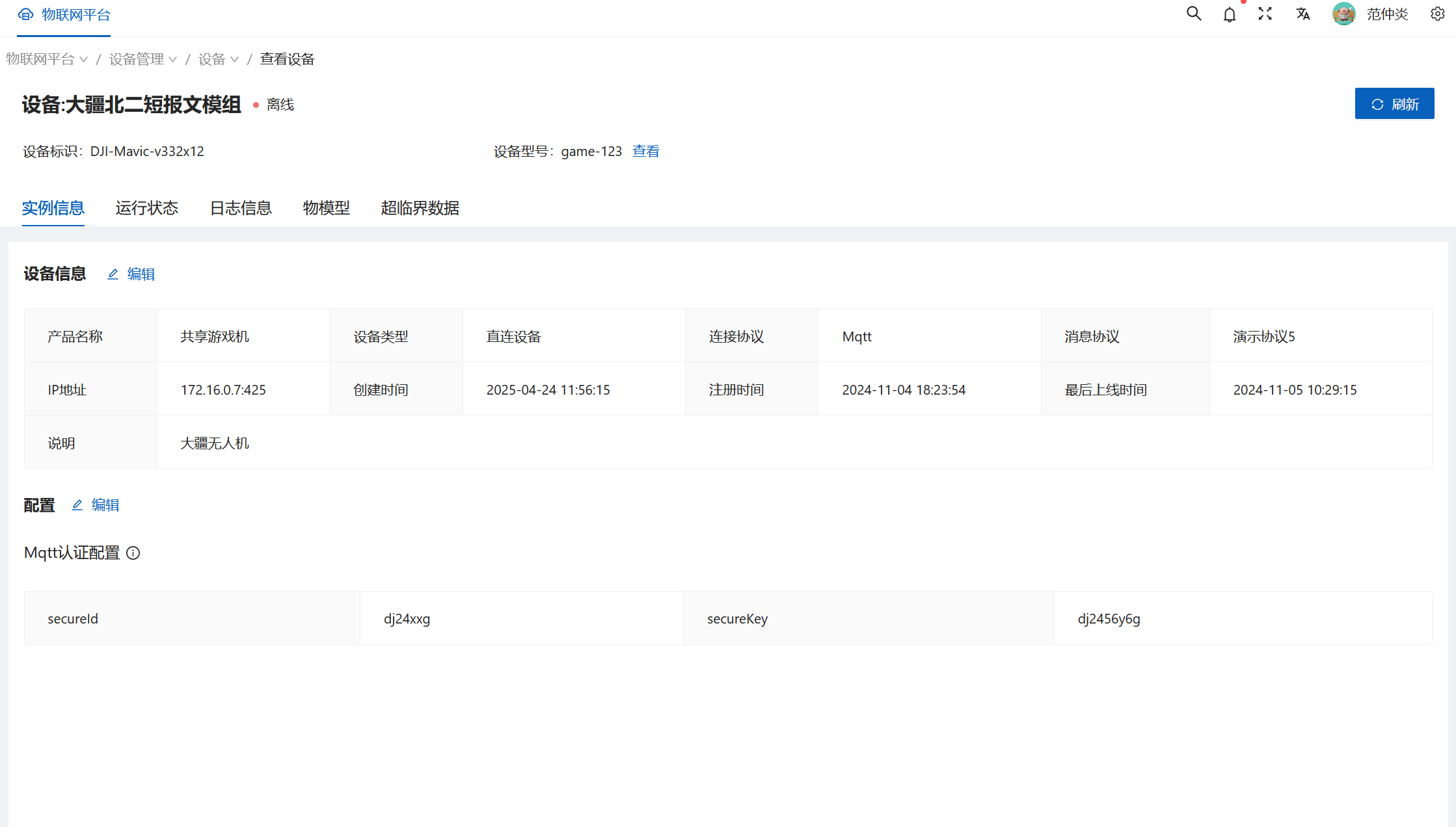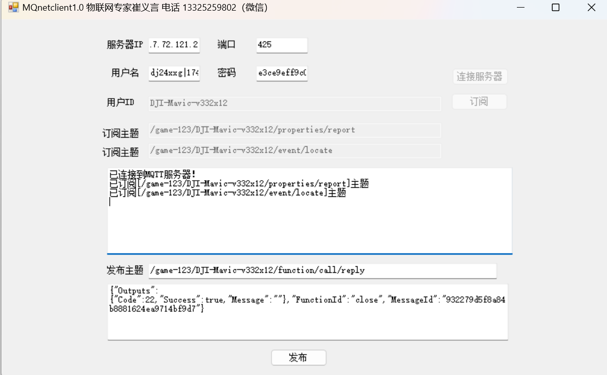 点击执行后,在MQTT客户端会接收一条消息,然后对于该命令消息进行回复通知服务端,表示设备已经执行, 对于消息回复需要发布主题为 /game-123/DJI-Mavic-v332x12/function/call/reply的消息,消息内容为