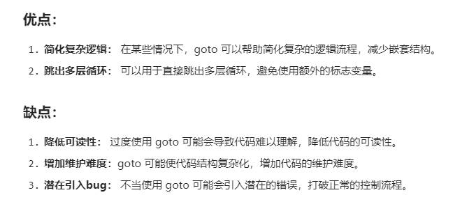 - goto 语句由关键字 goto 后跟一个标签名称组成,通过标签名称指定跳转的位置。
