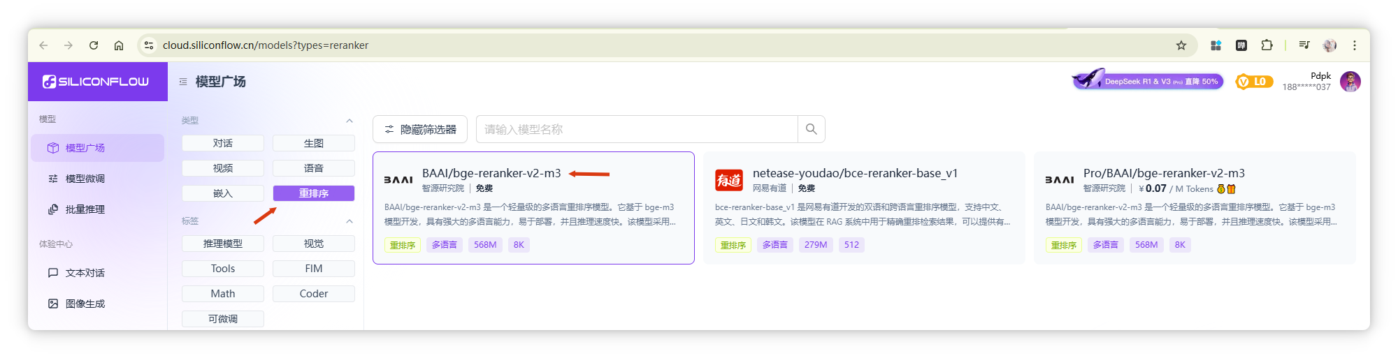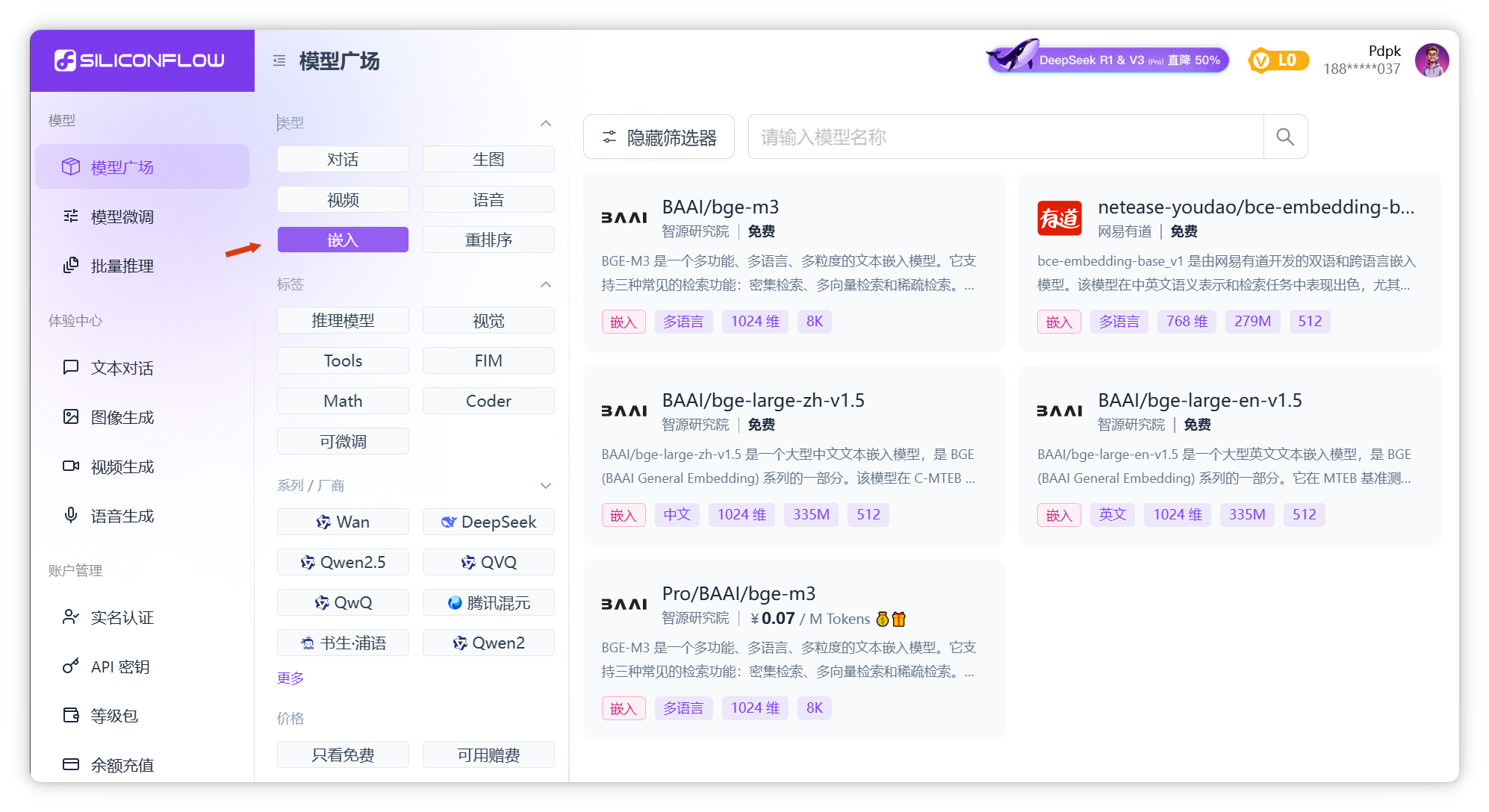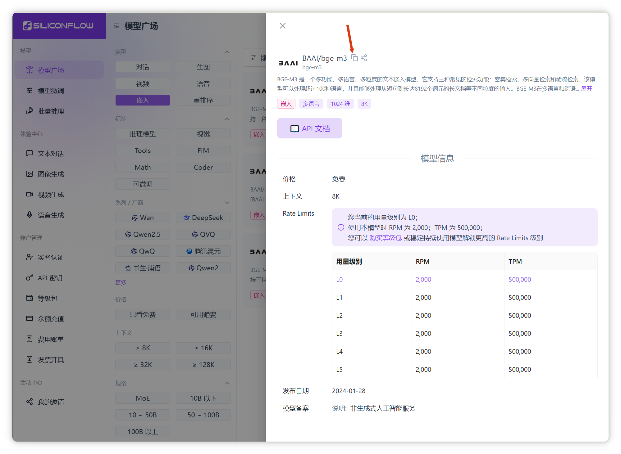 回到硅基流动“模型广场”,筛选“类型”为“嵌入”,选择“bge-m3(免费)”,复制模型名称。