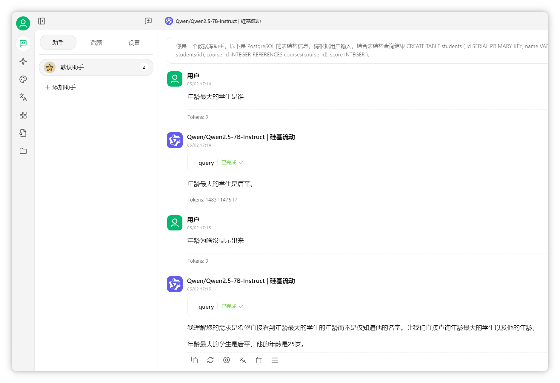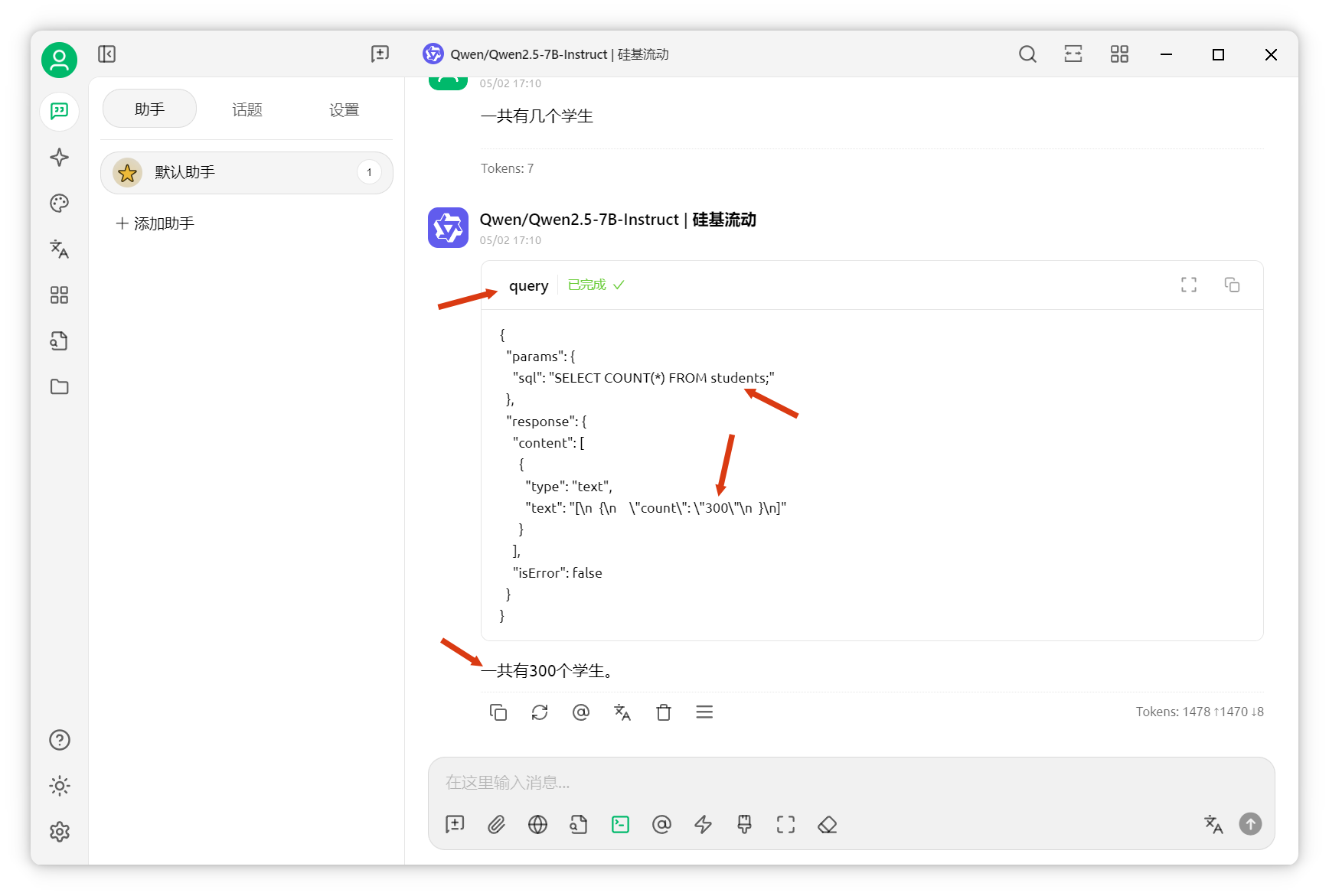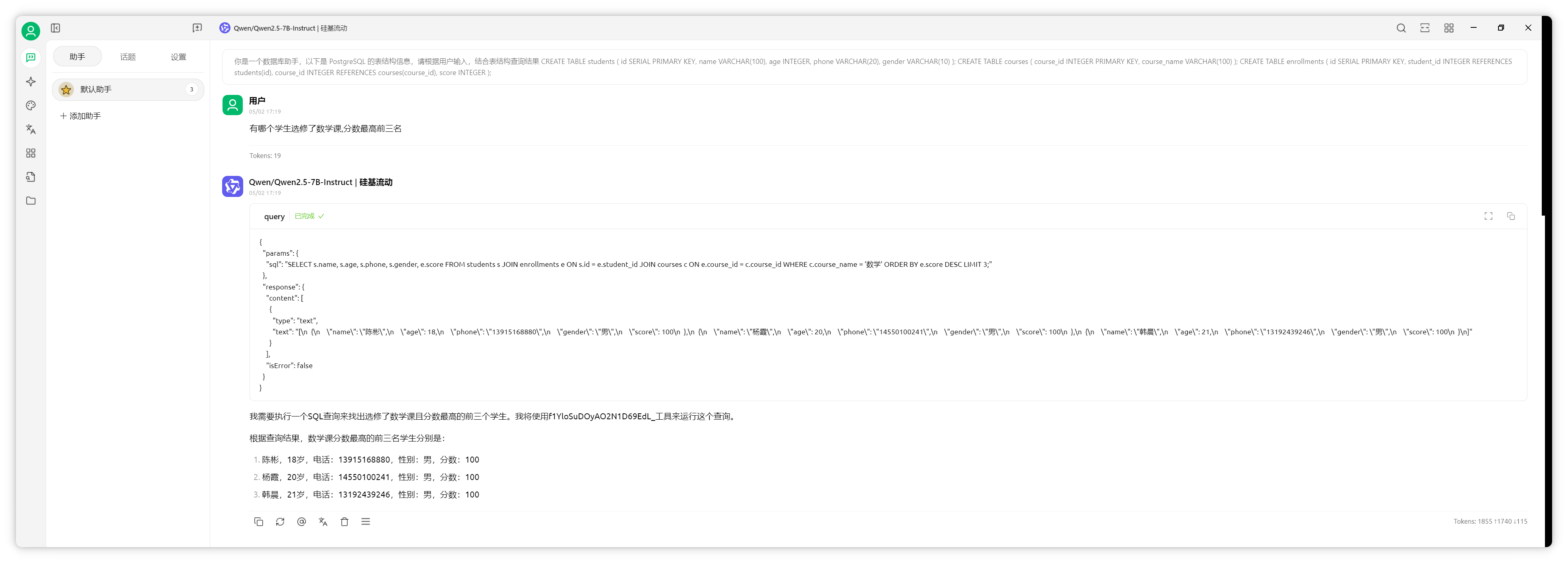 AI可成功调用MCP server,通过SQL查询返回结果。需选择支持工具调用的模型。