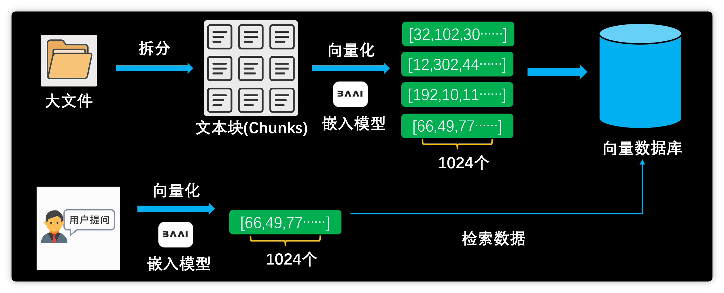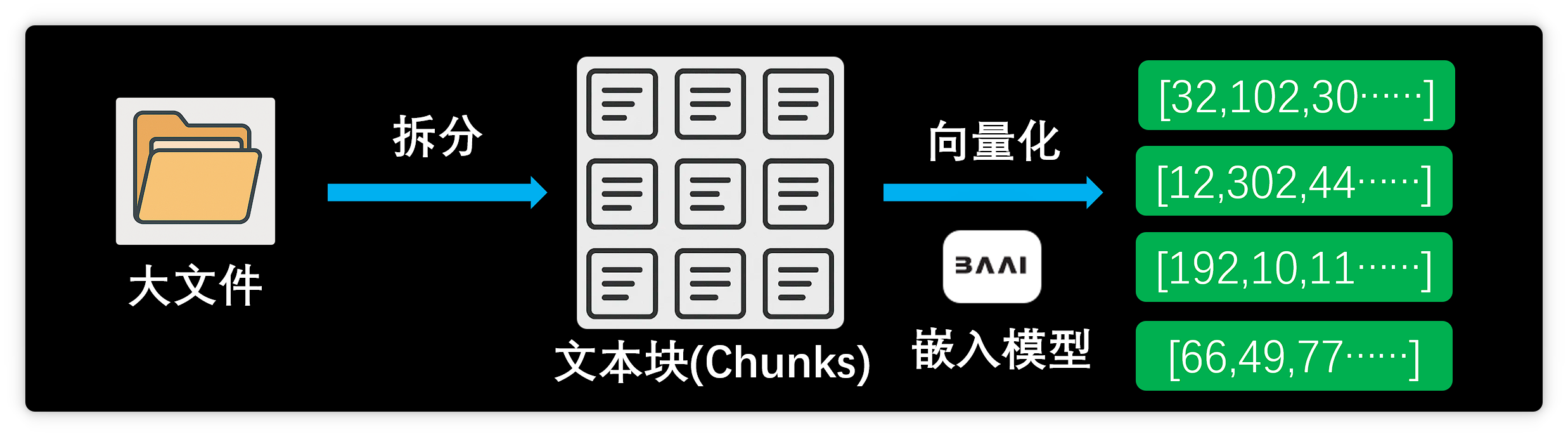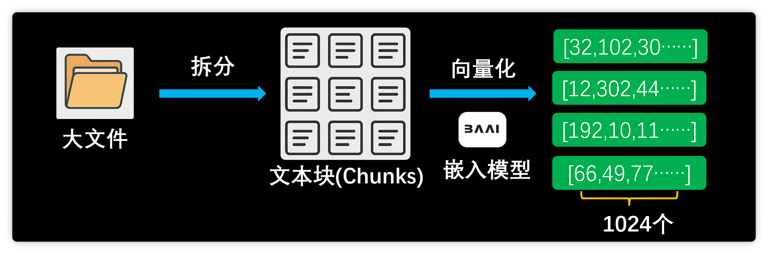 随后,嵌入模型将这些文本块向量化,即将文本转为一组超长数字序列。