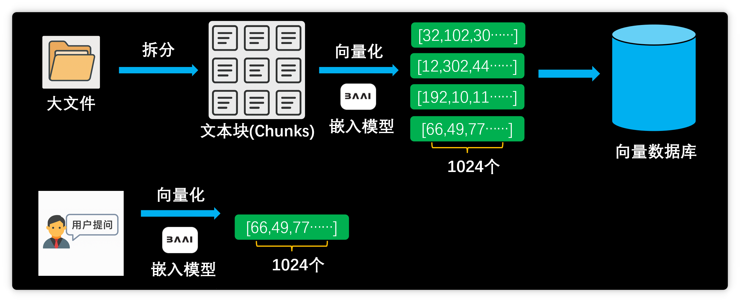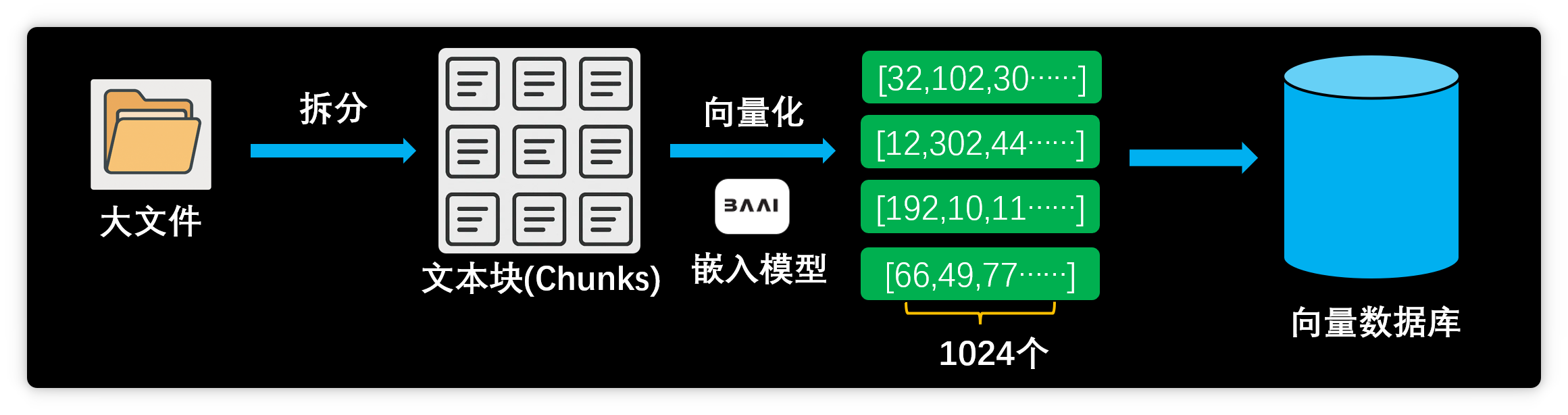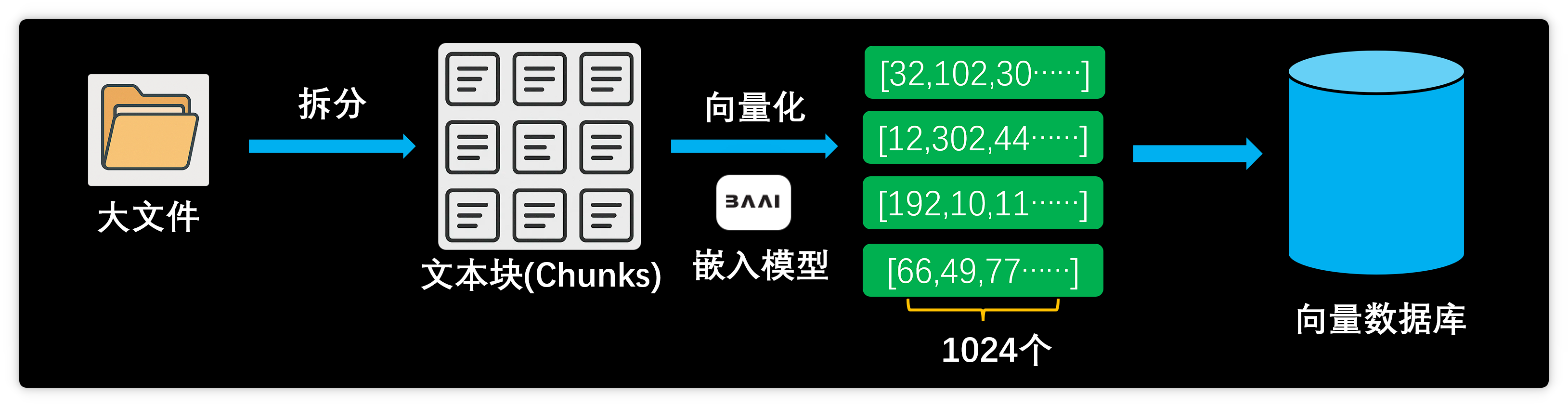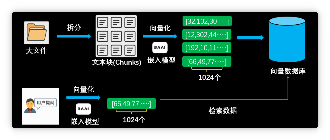 随后,嵌入模型将这些文本块向量化,即将文本转为一组超长数字序列。