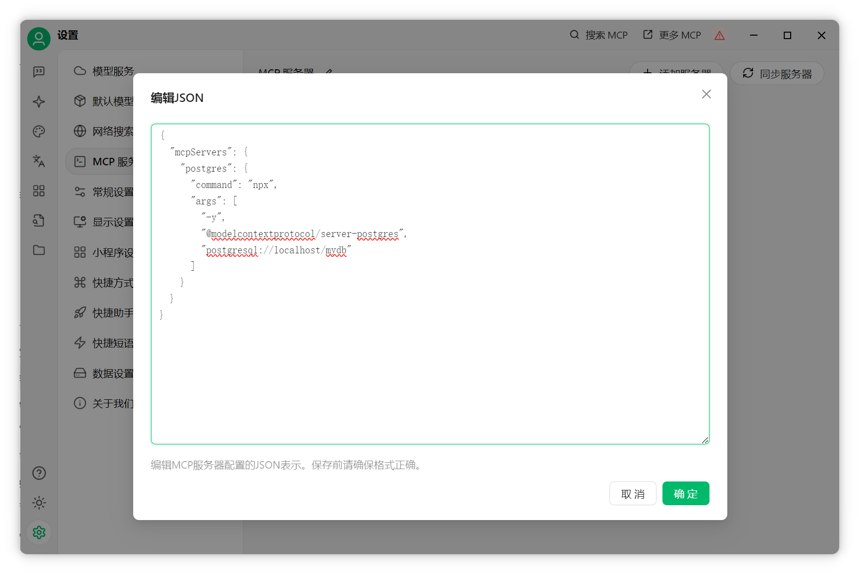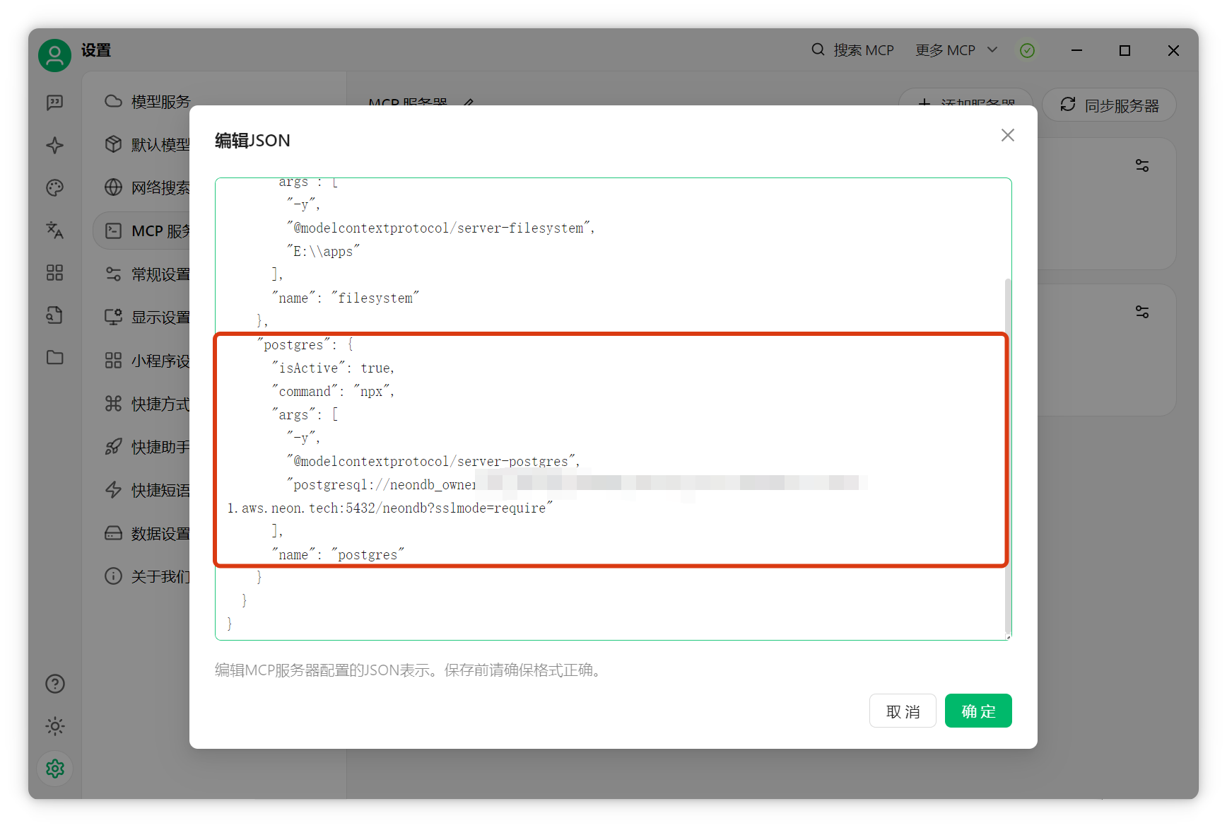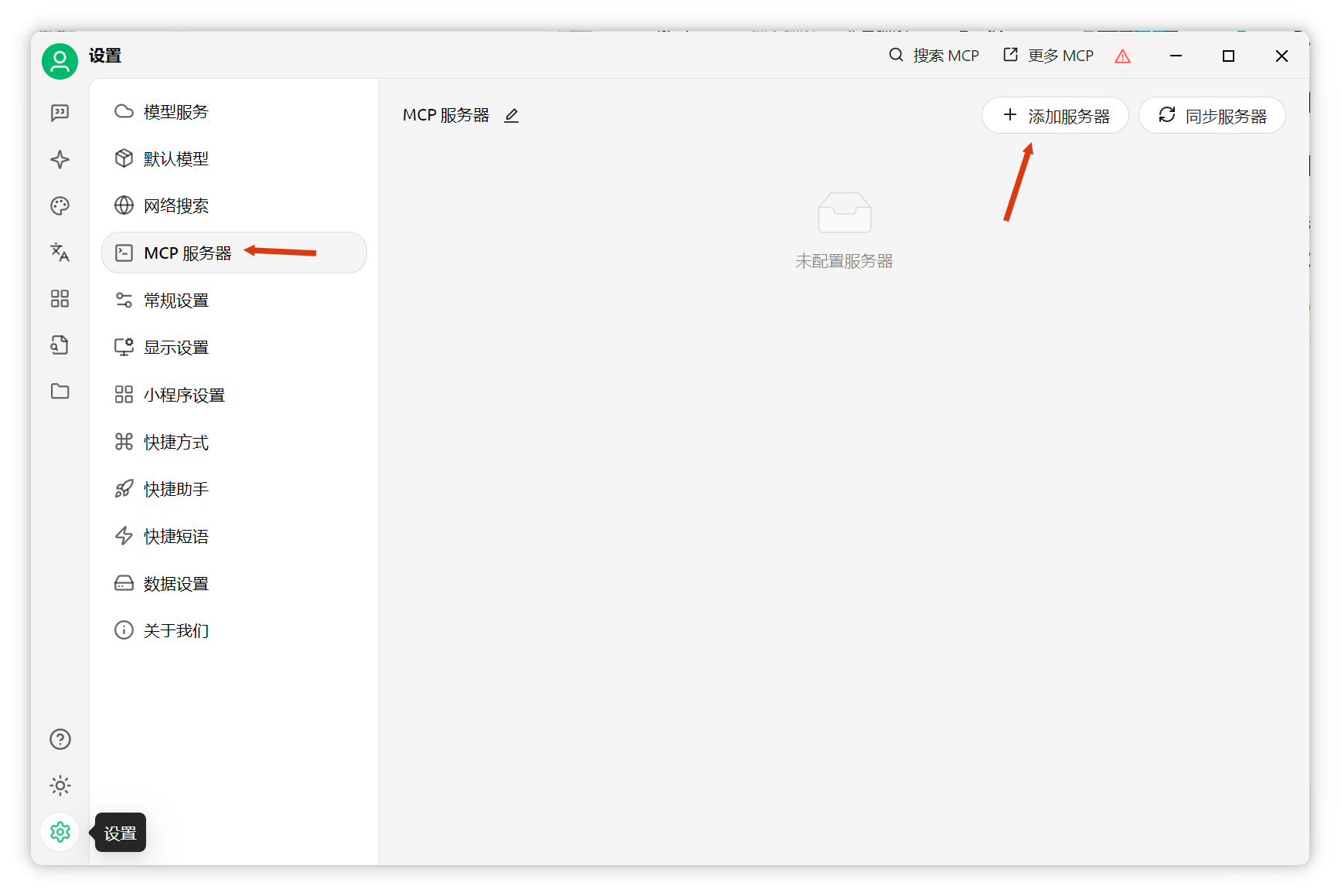 在Cherry Studio配置MCP server,使AI可访问数据库。进入设置,添加MCP服务器。