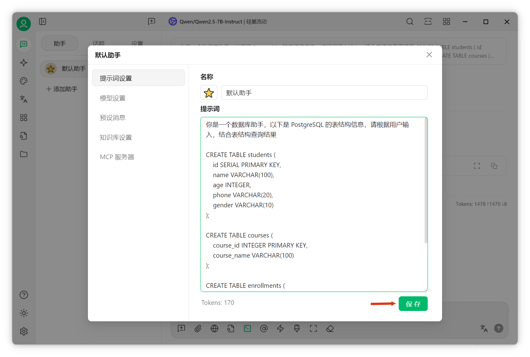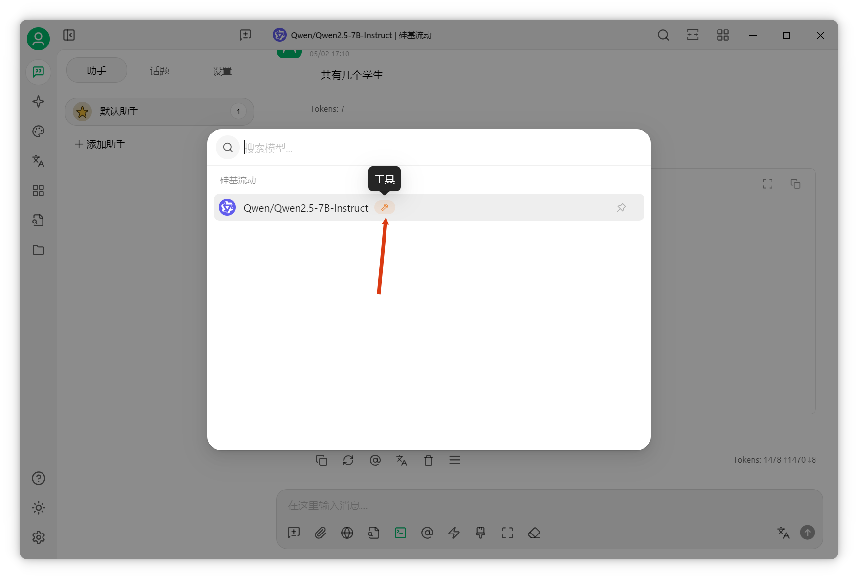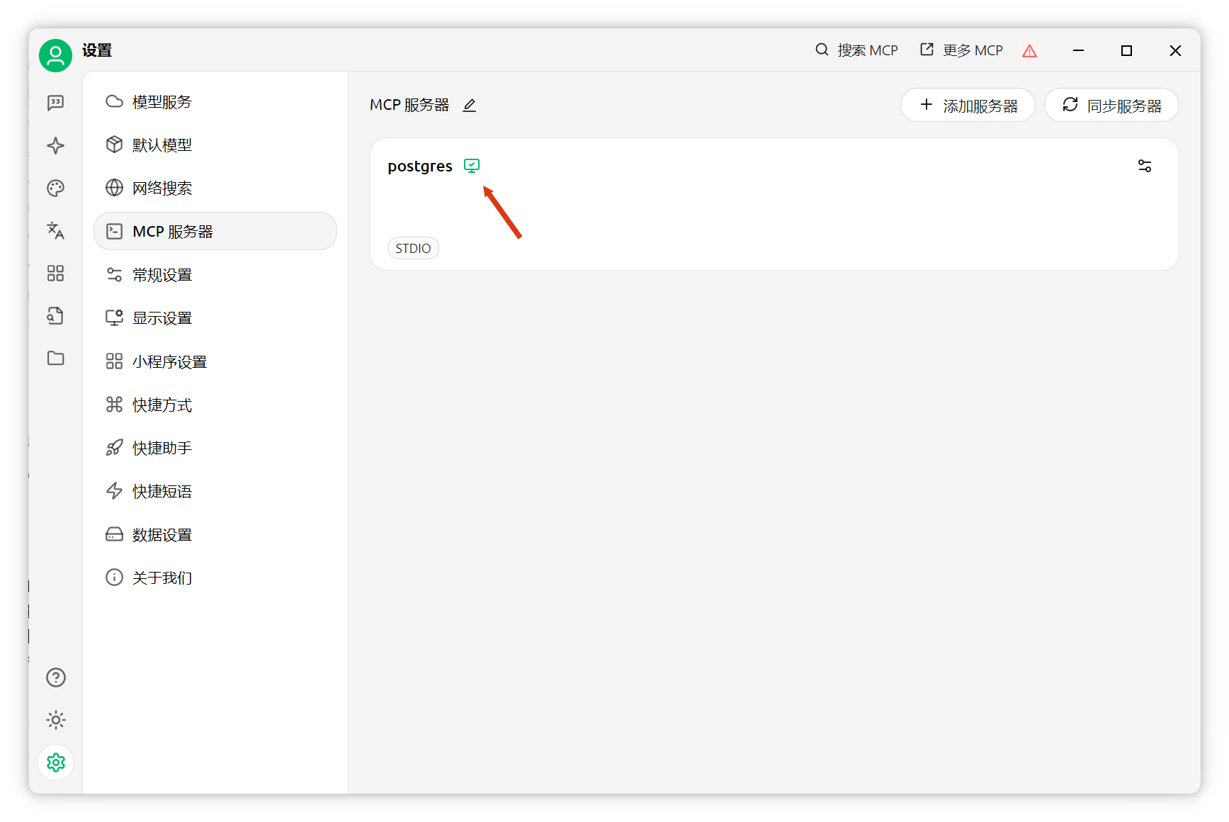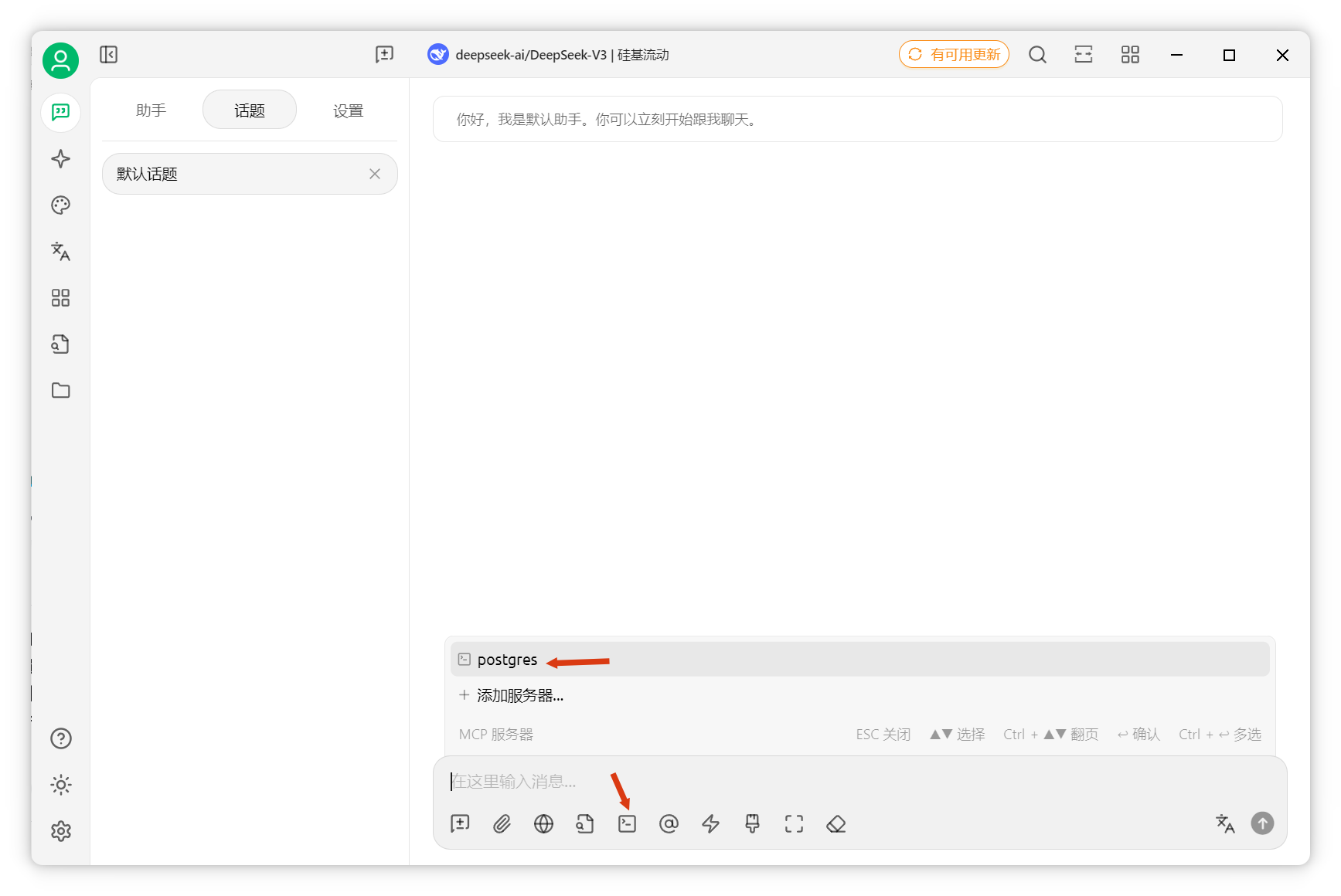 回到聊天界面(需选择支持函数调用的模型,模型名后有扳手图标),选择刚配置的Postgres MCP服务器。