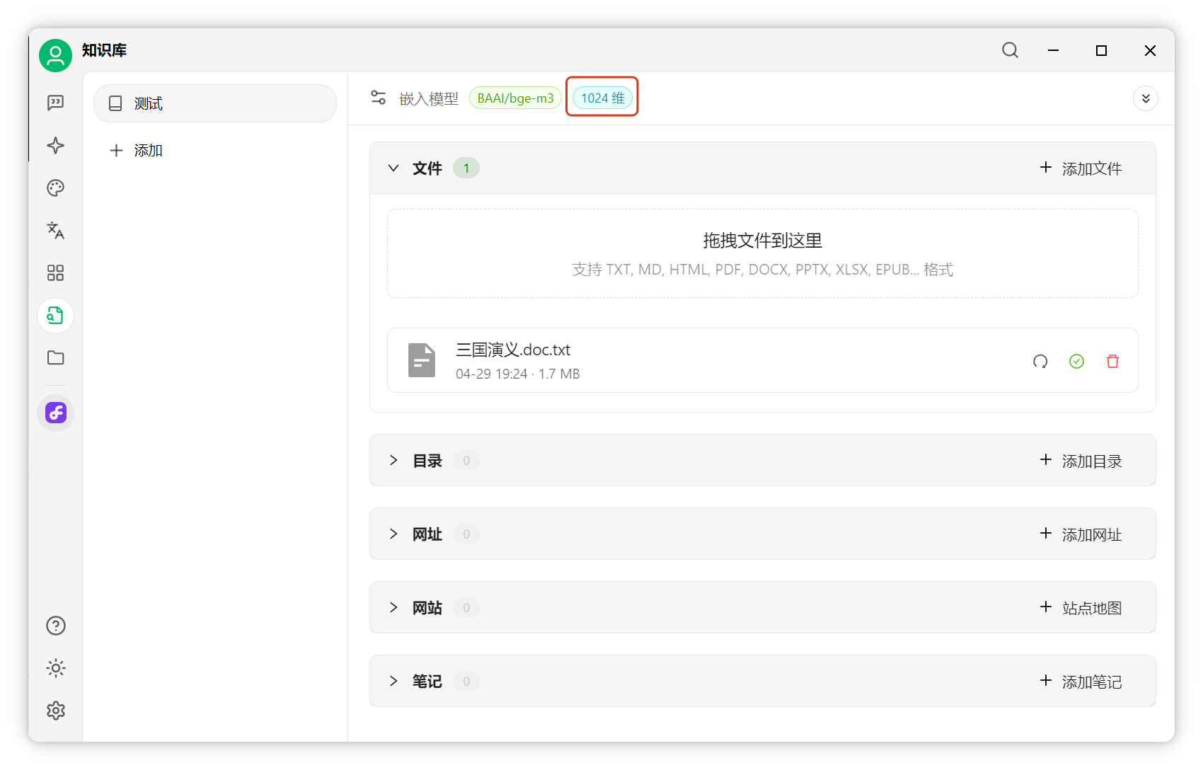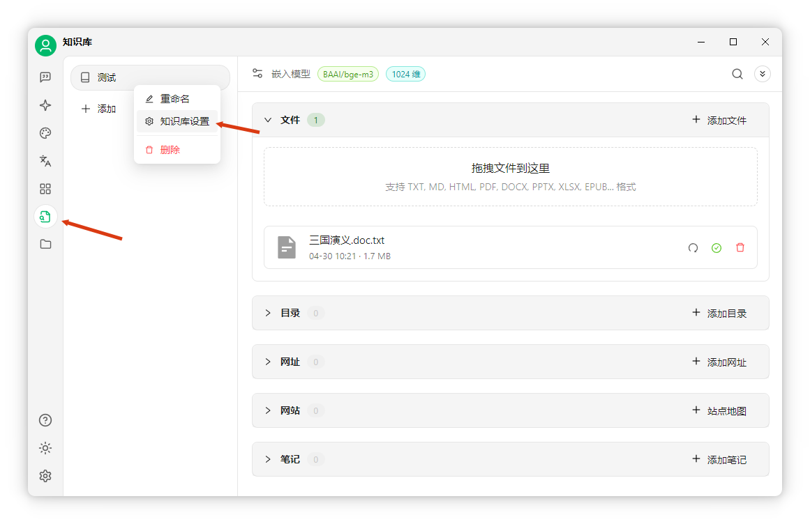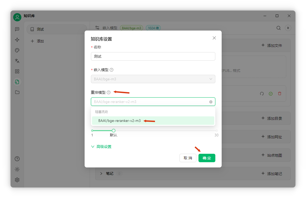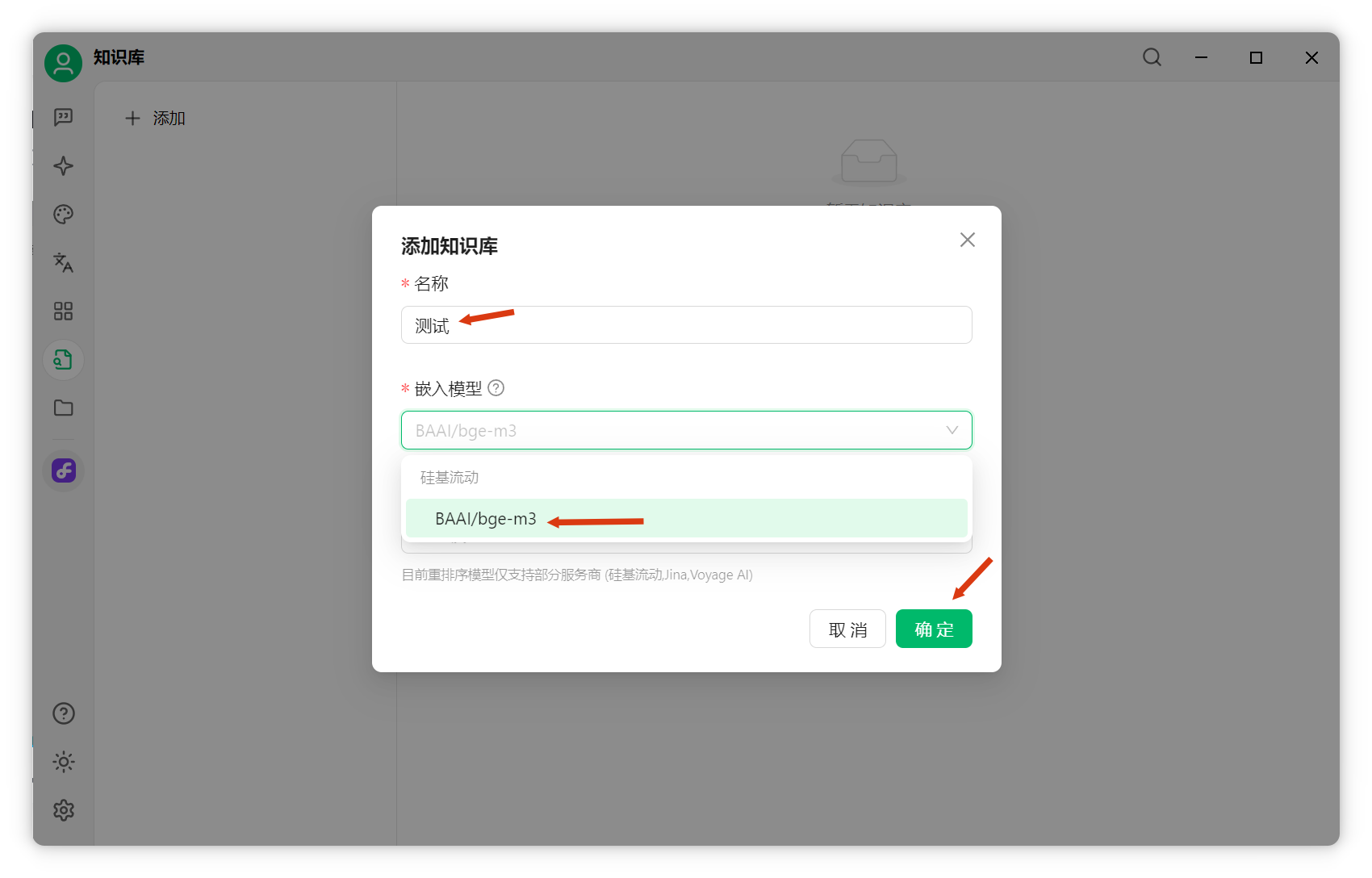 配置知识库:点击左侧“知识库”-“添加”,填写名称,选择刚添加的嵌入模型,点击确定。