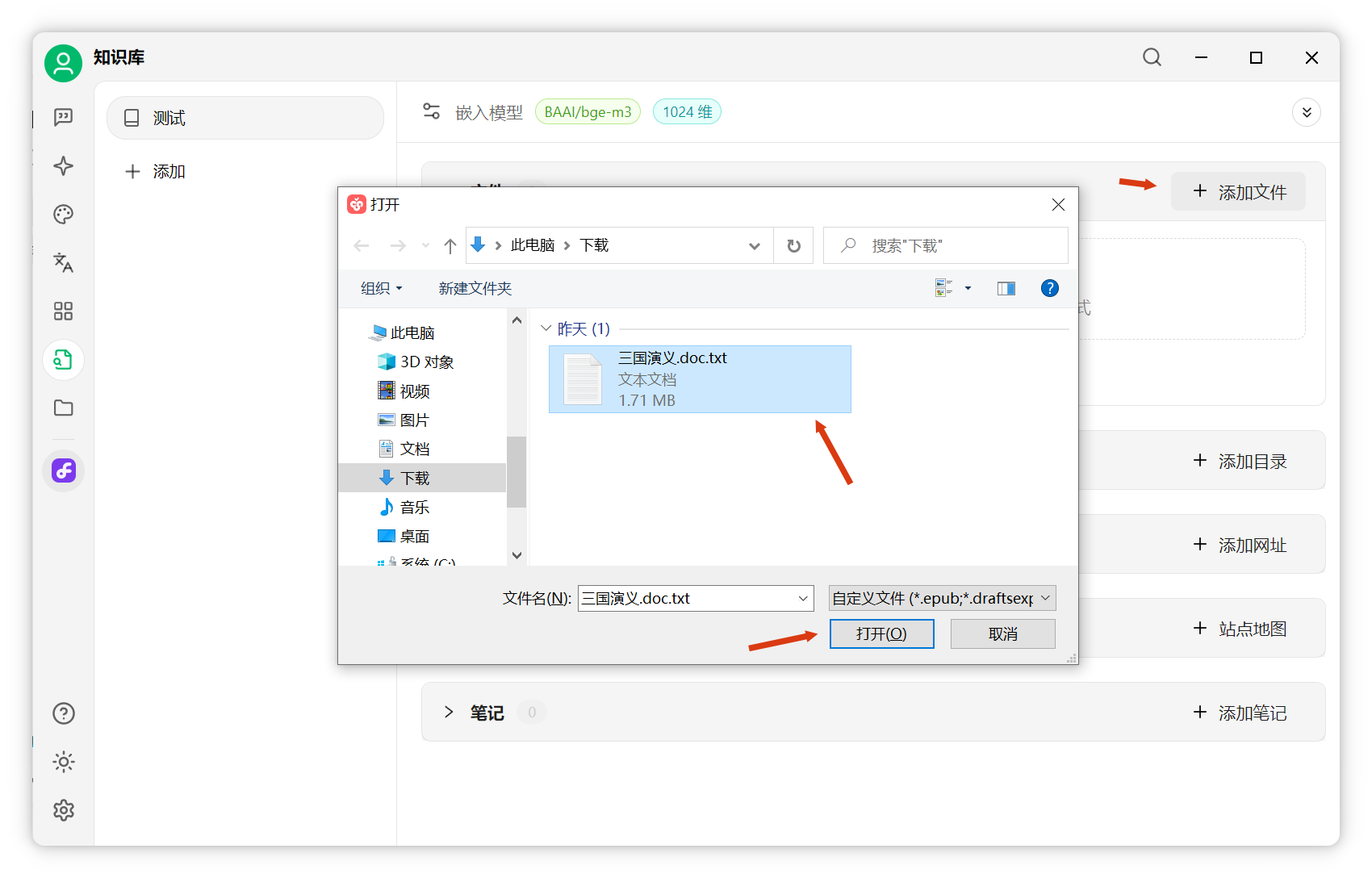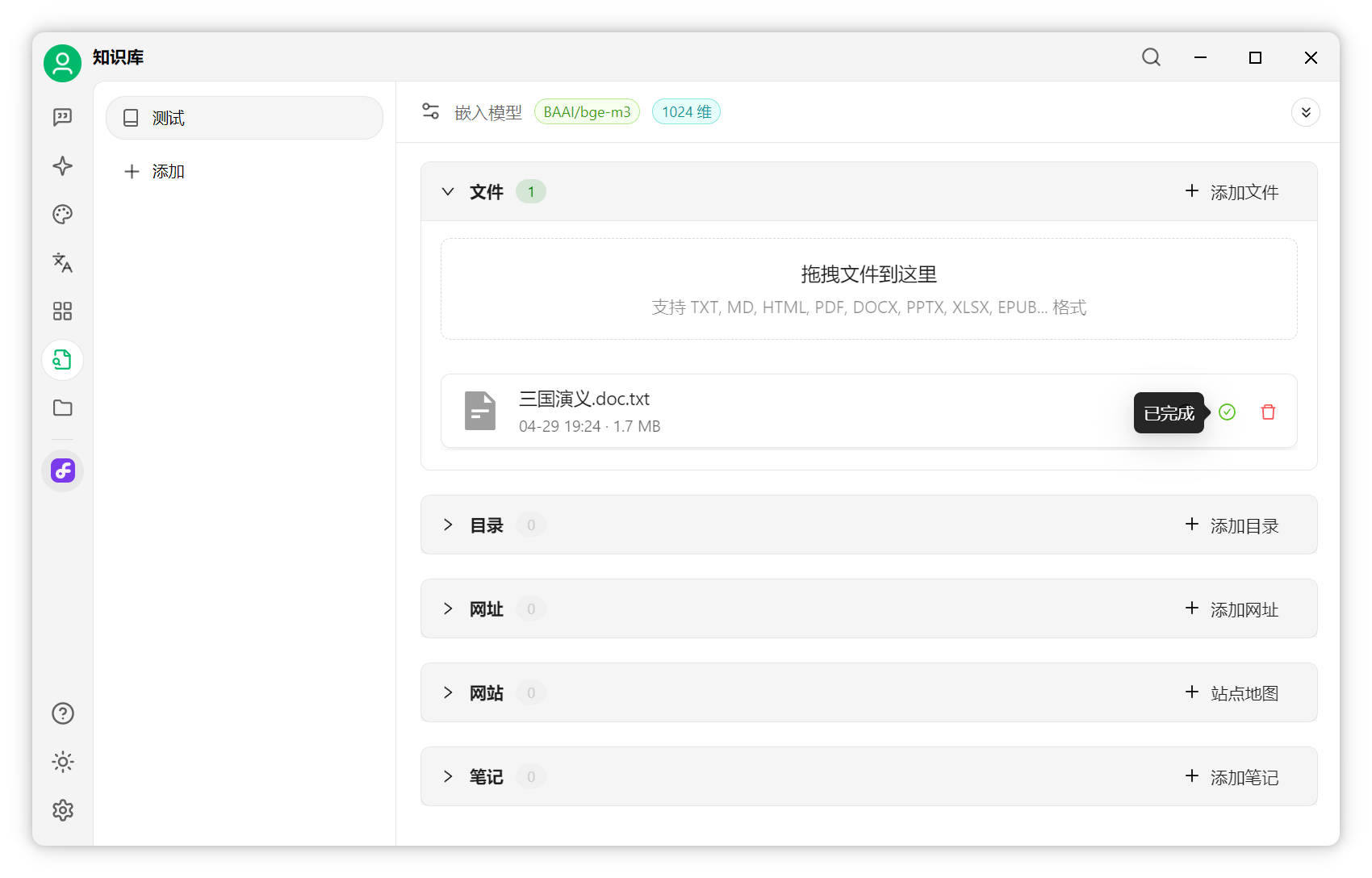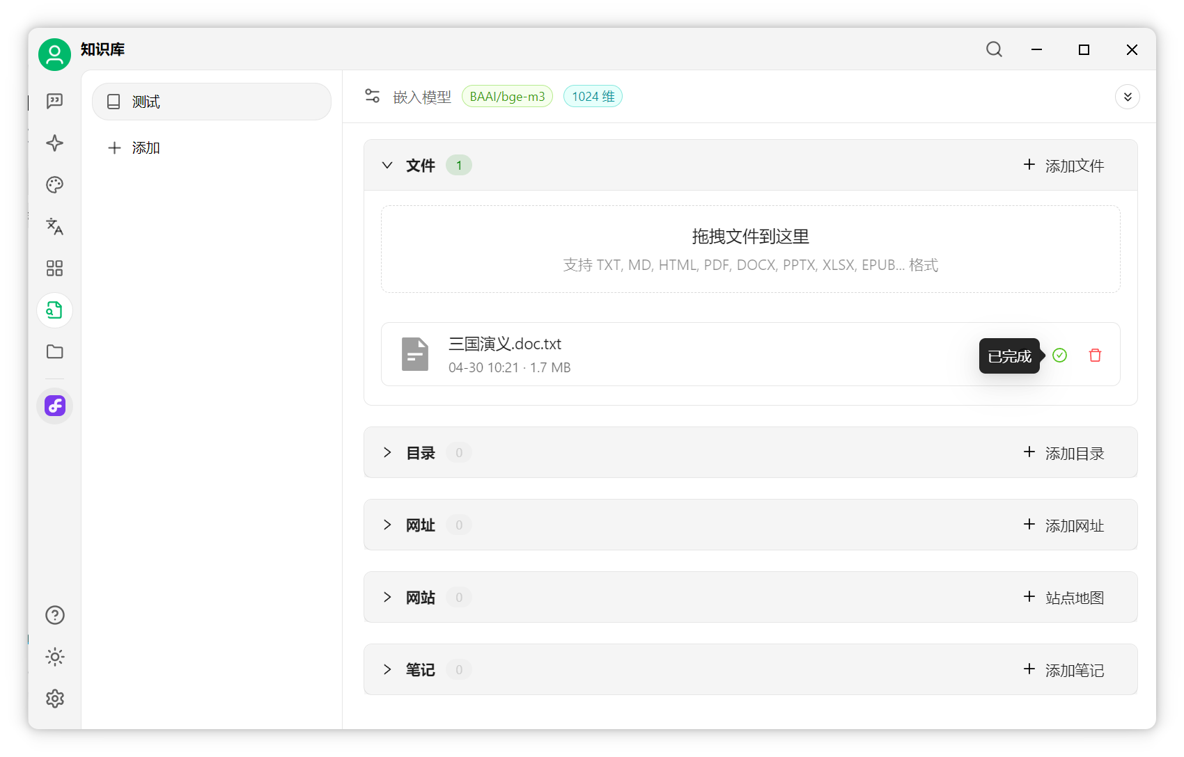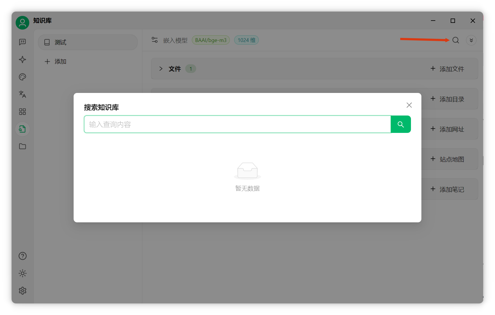 配置知识库:点击左侧“知识库”-“添加”,填写名称,选择刚添加的嵌入模型,点击确定。