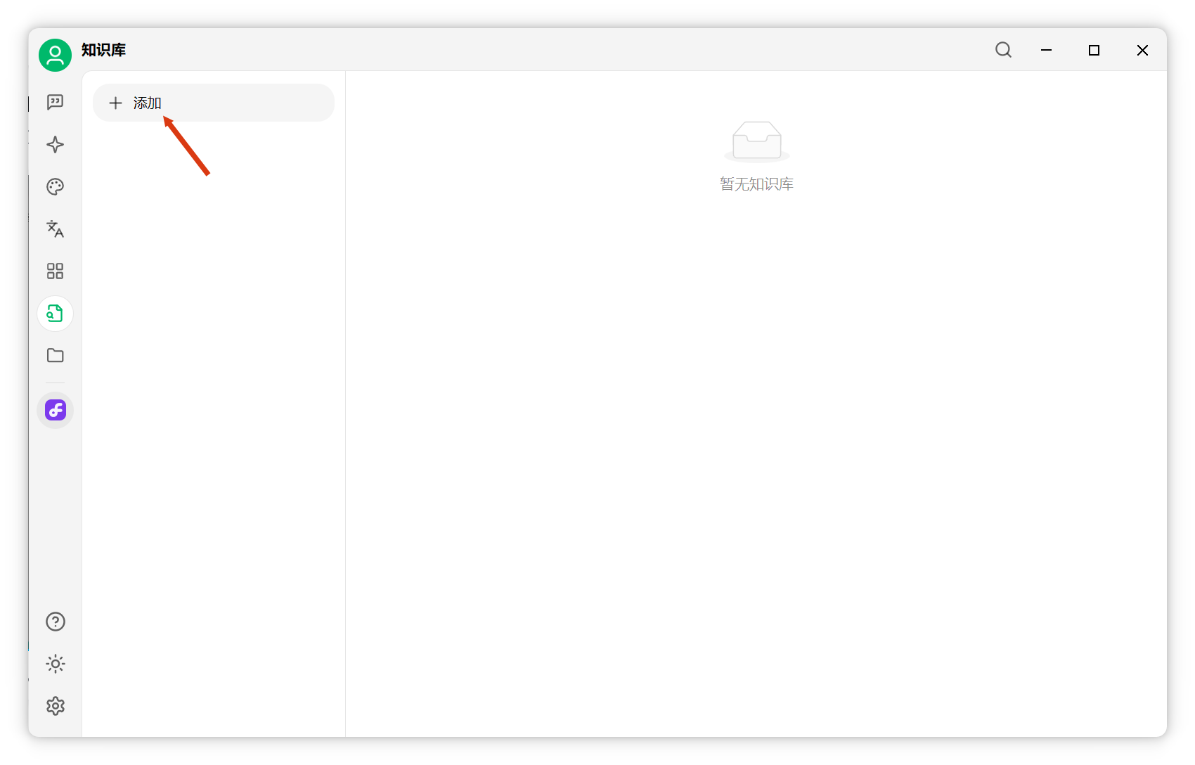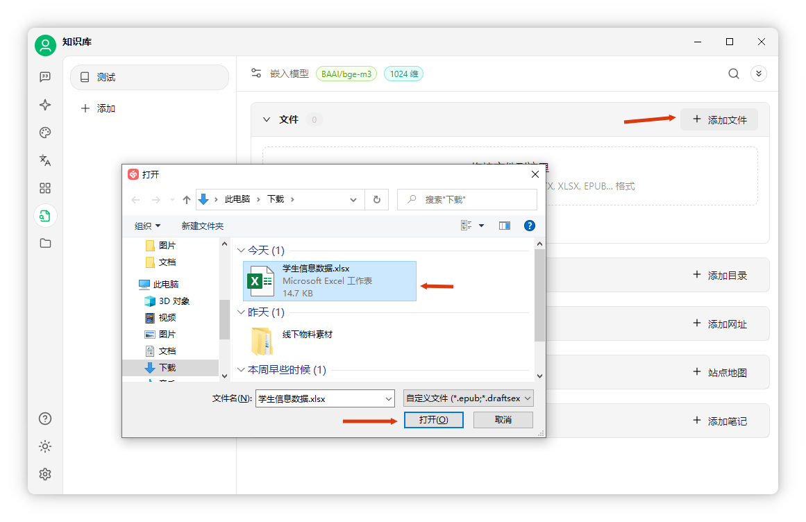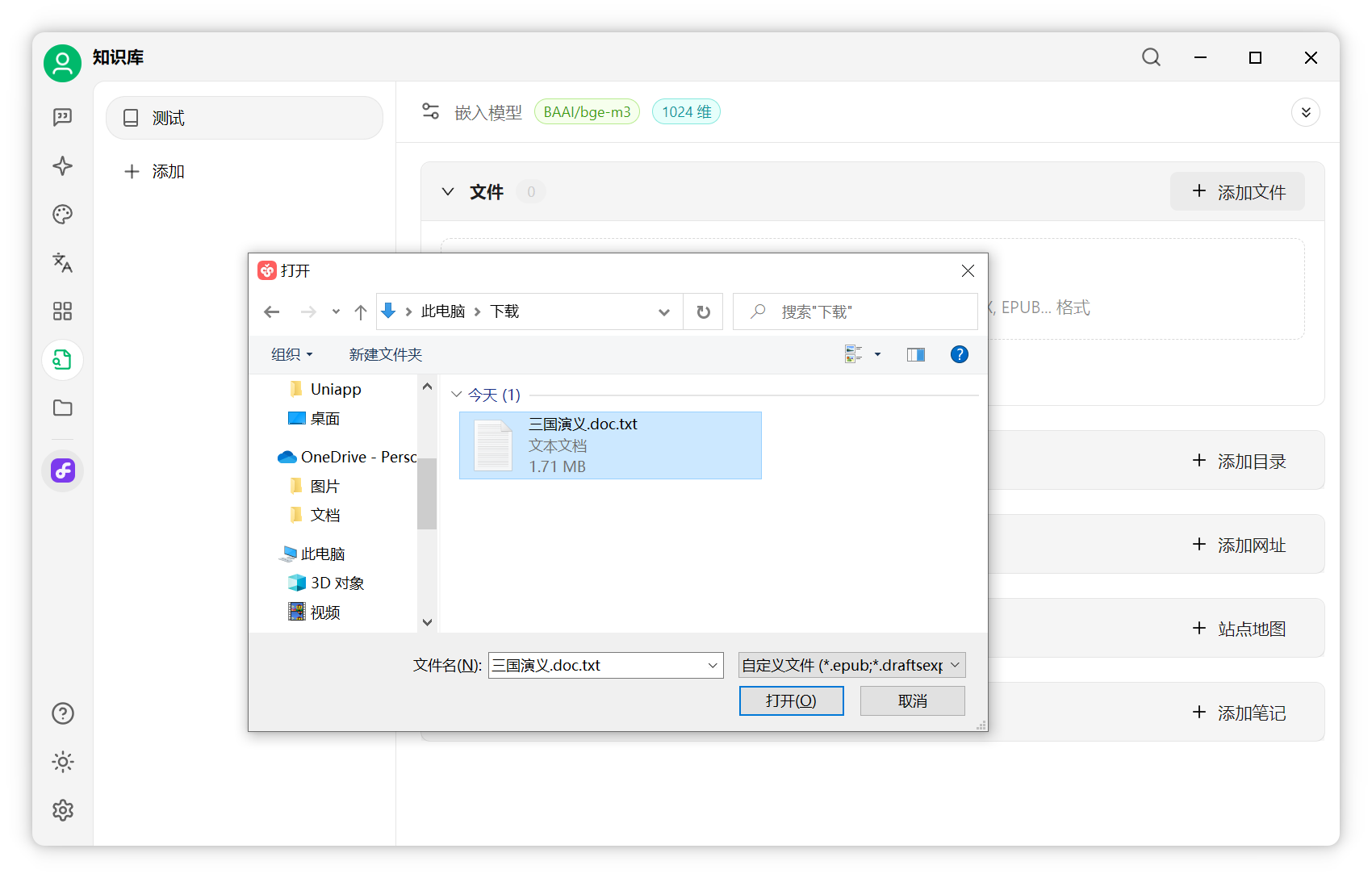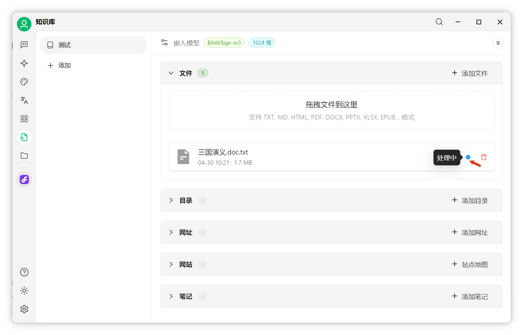 配置知识库:点击左侧“知识库”-“添加”,填写名称,选择刚添加的嵌入模型,点击确定。