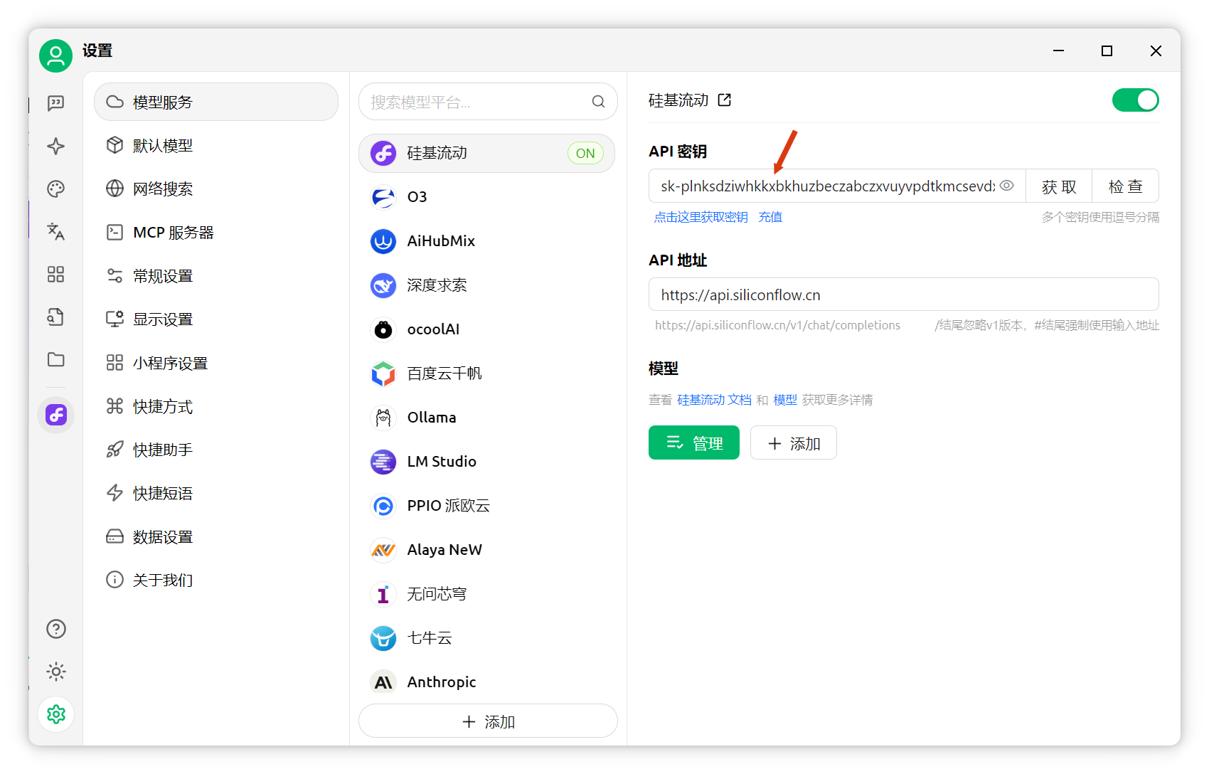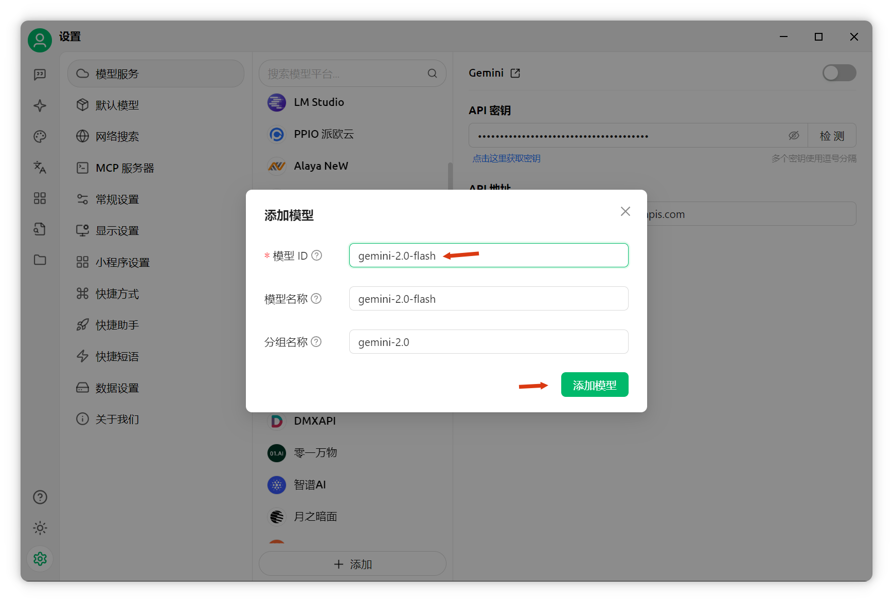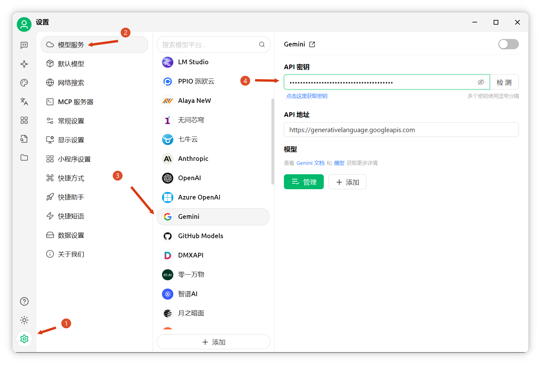 回到Cherry Studio,设置模型服务商为Gemini,填写API密钥。
