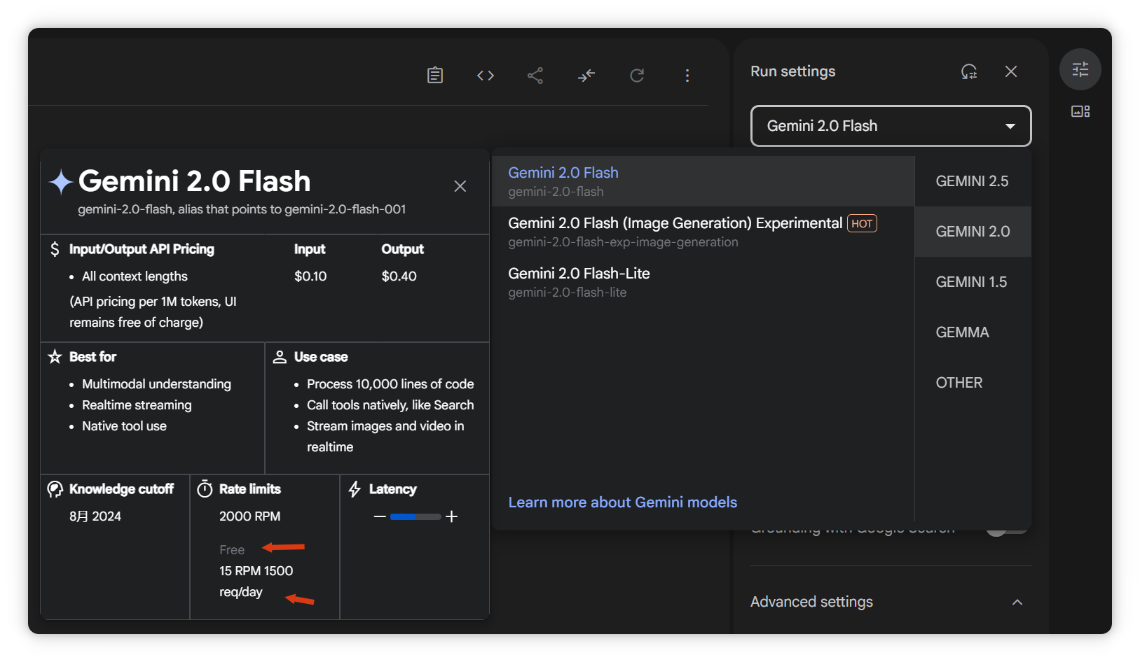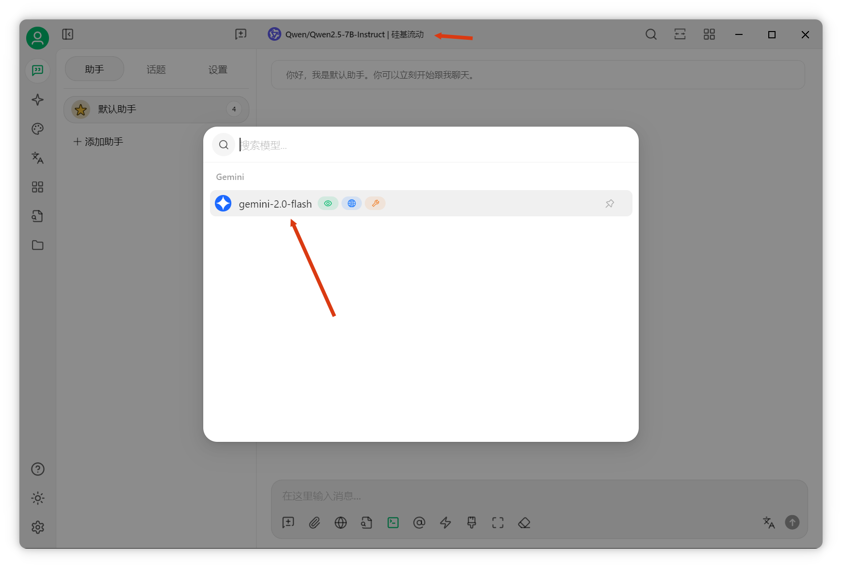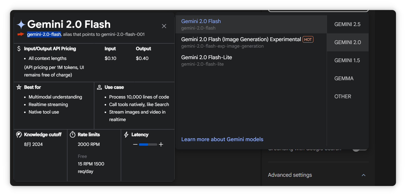 添加模型,点击“添加”,模型ID可在AI Studio选择。以Gemini 2.0 Flash为例,支持100万token上下文,且有免费额度。