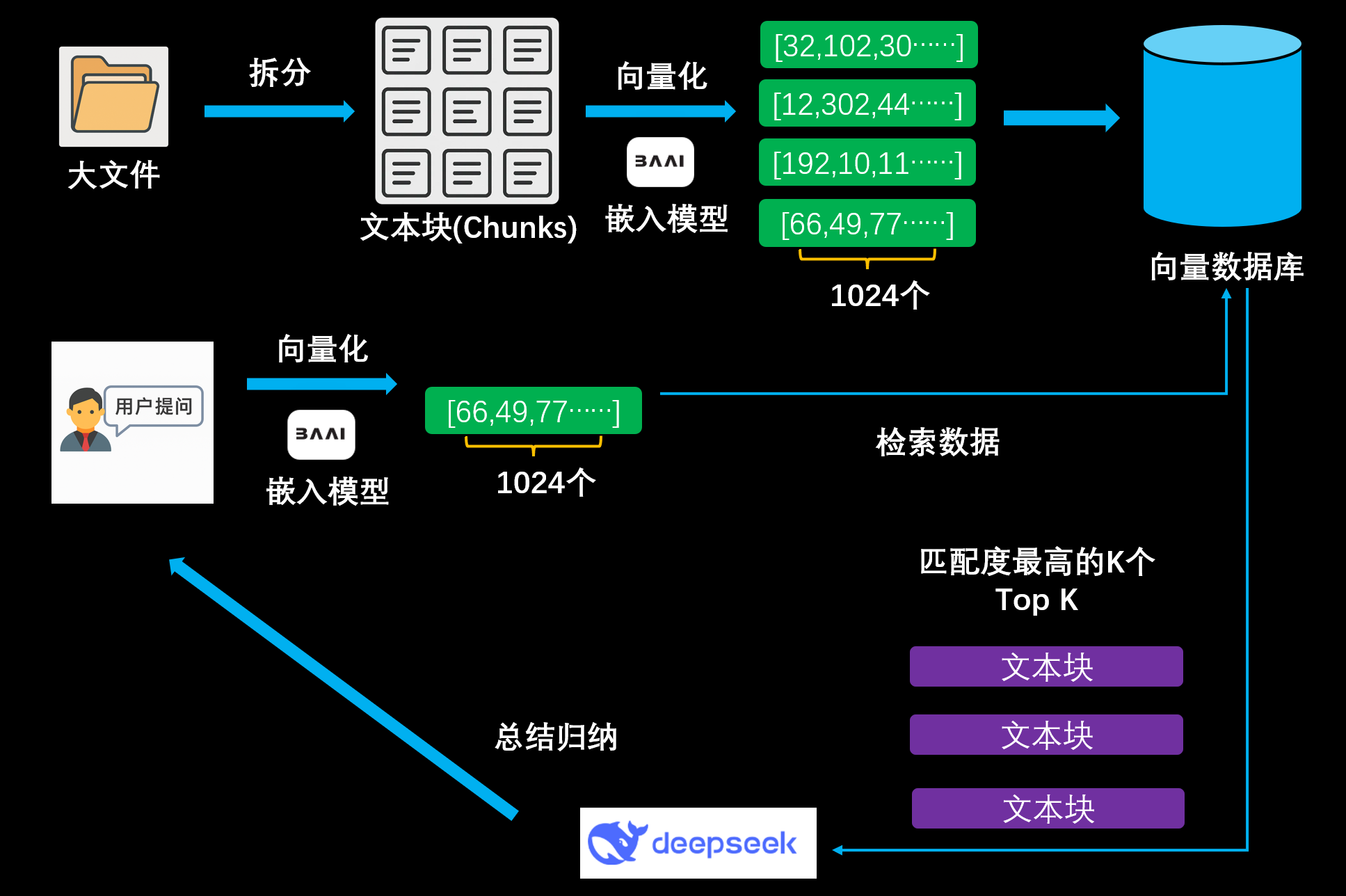 最终,知识库选出最相似的原文片段,与用户问题一同发送给大模型,由其归纳总结。