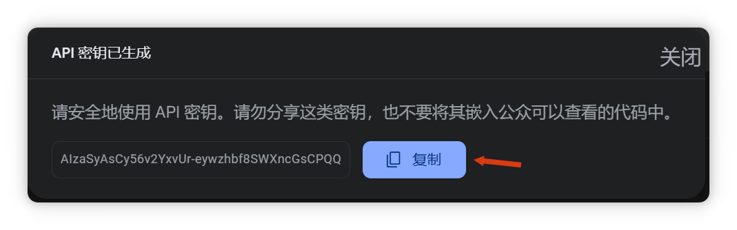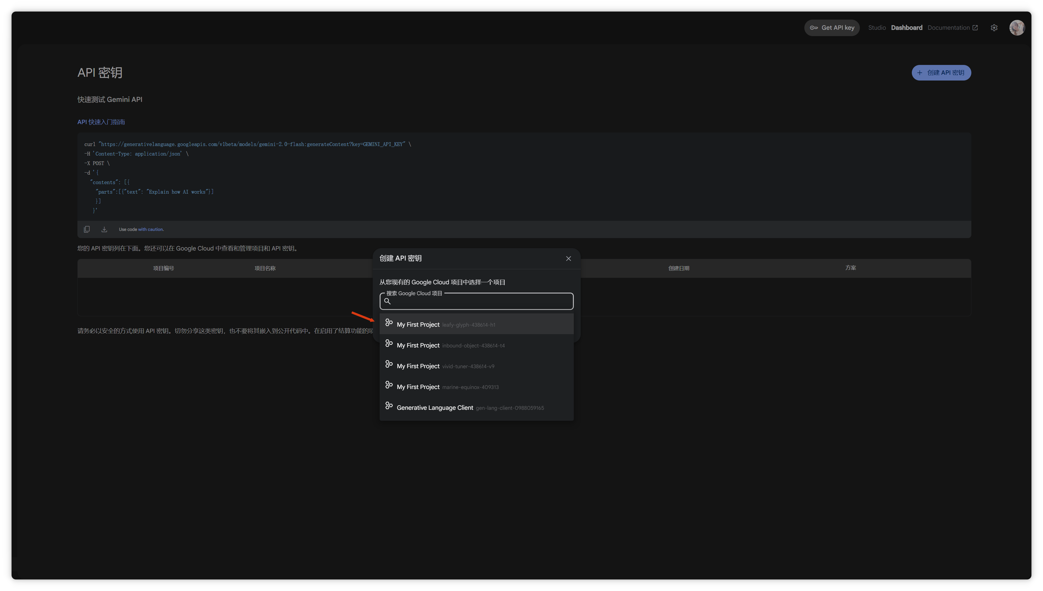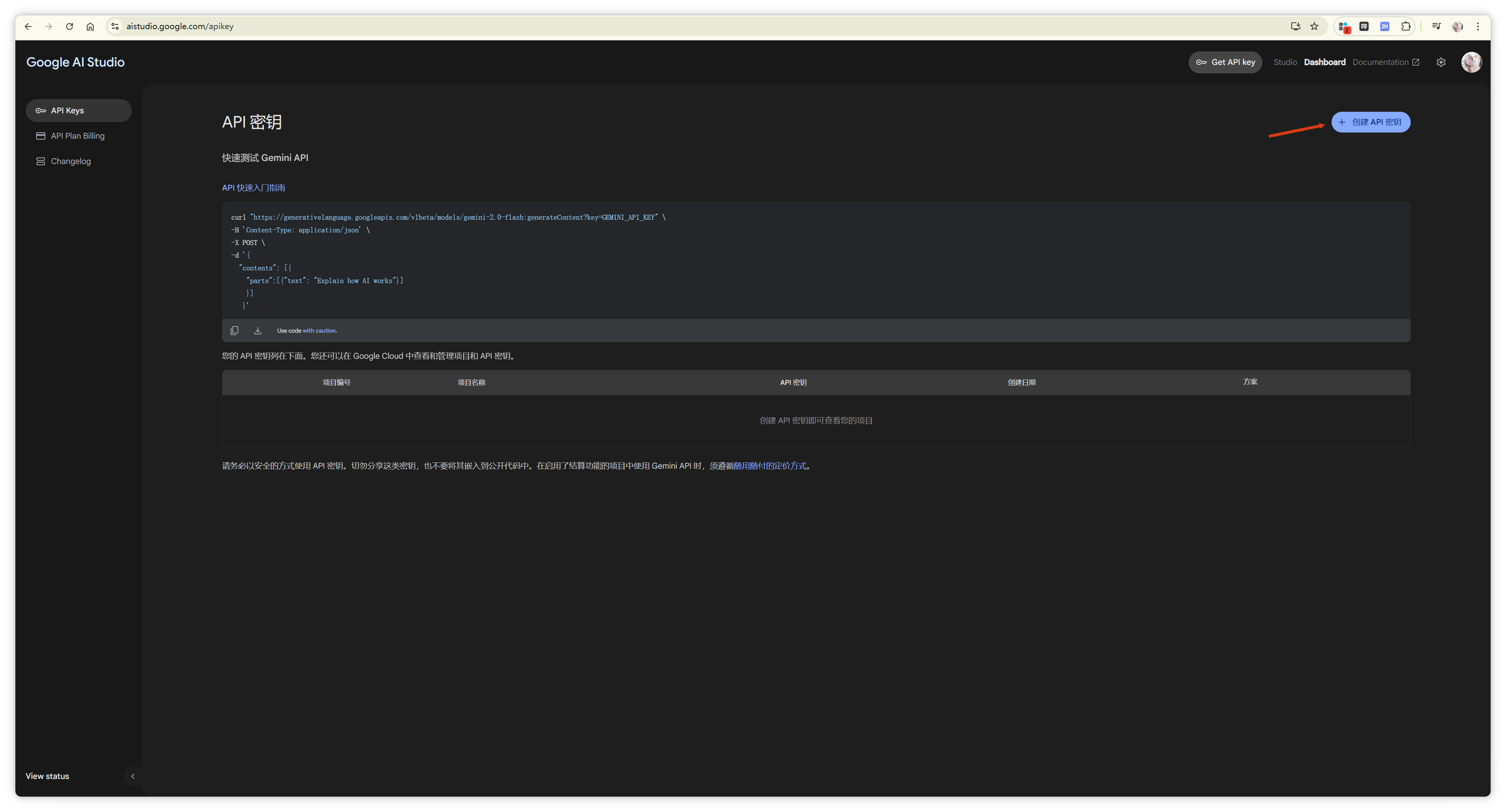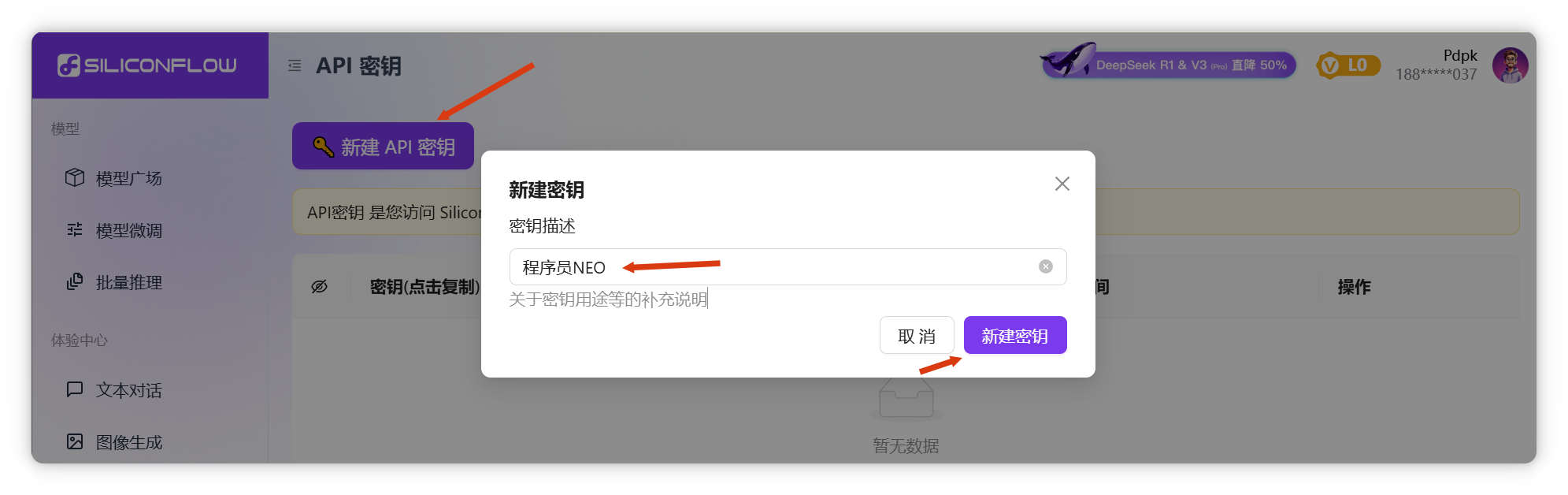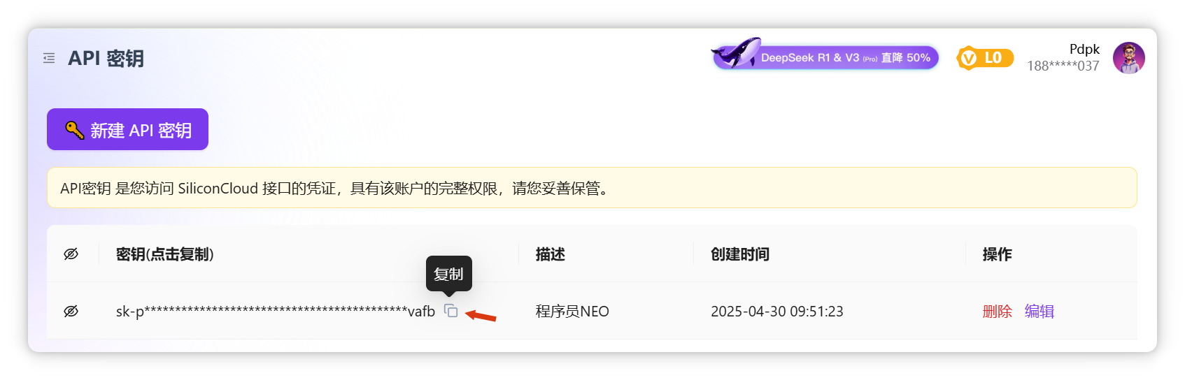点击左侧“API密钥”,新建密钥(如“程序员NEO”),复制生成的密钥。