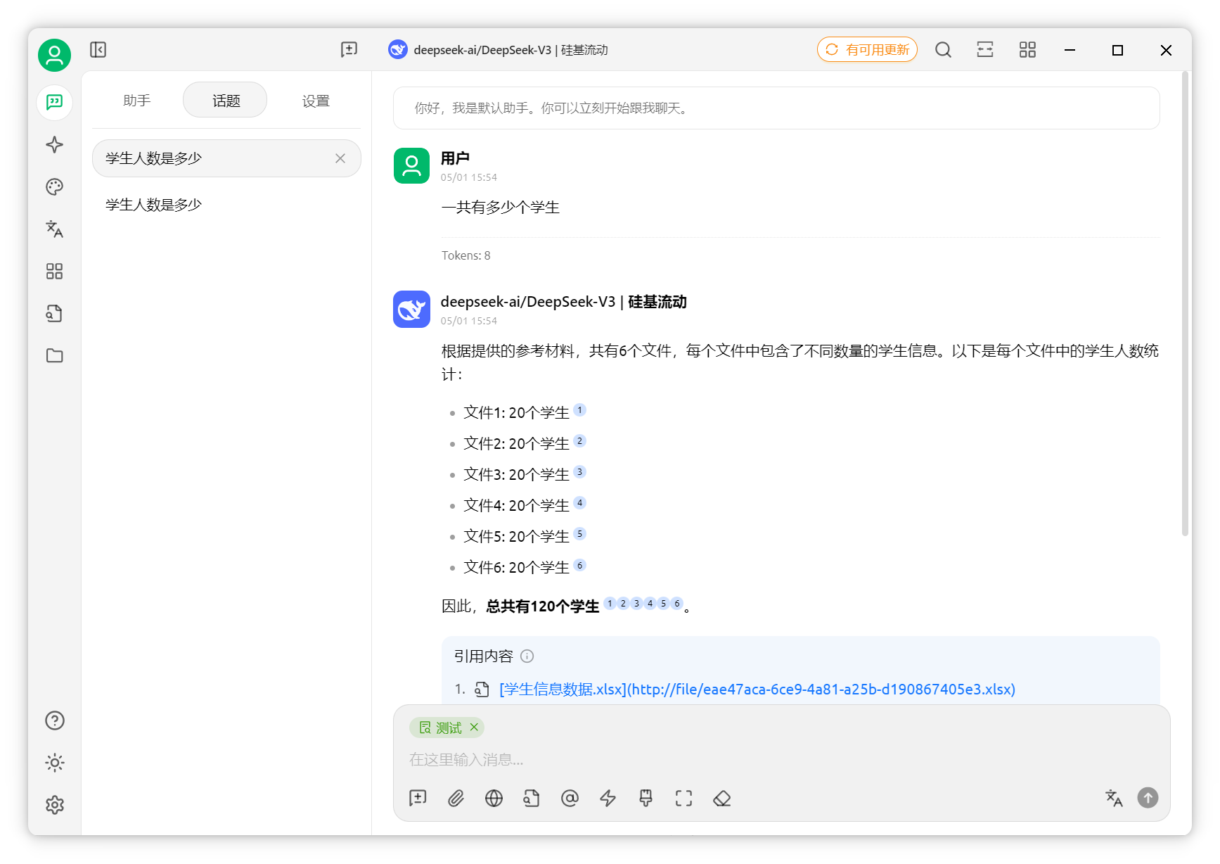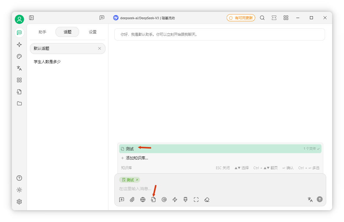 在聊天界面(使用DeepSeek,硅基流动提供),开启知识库。