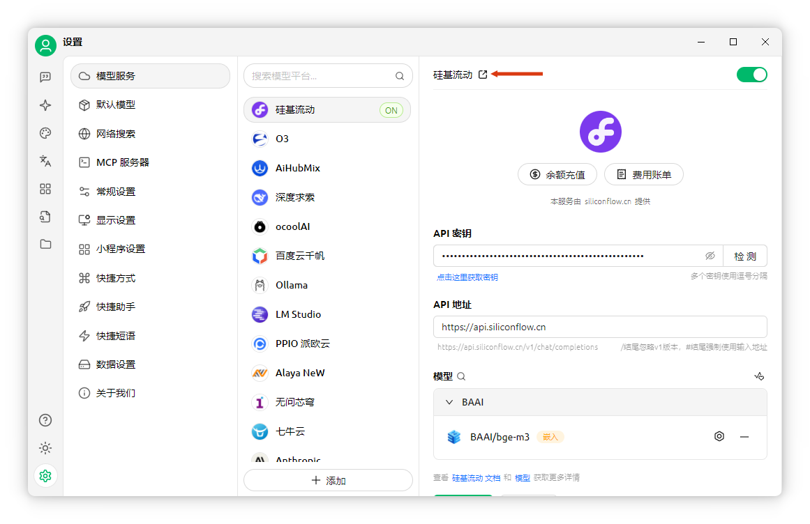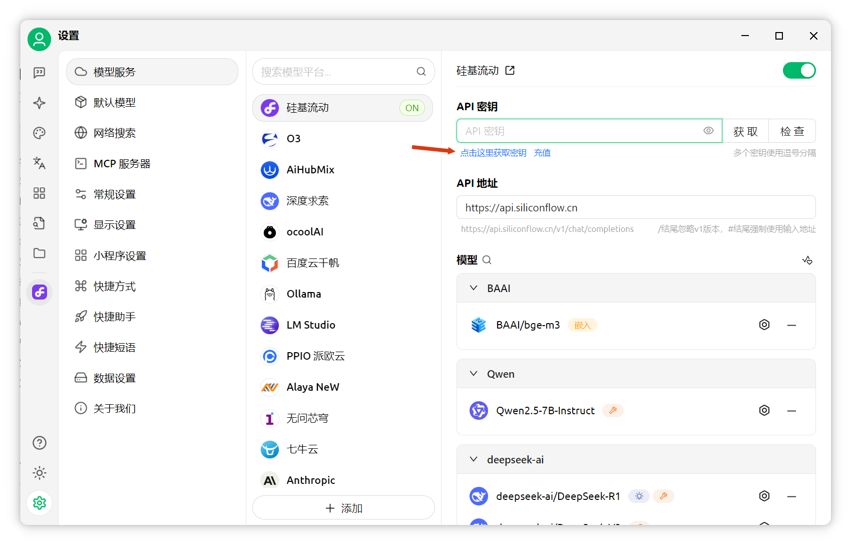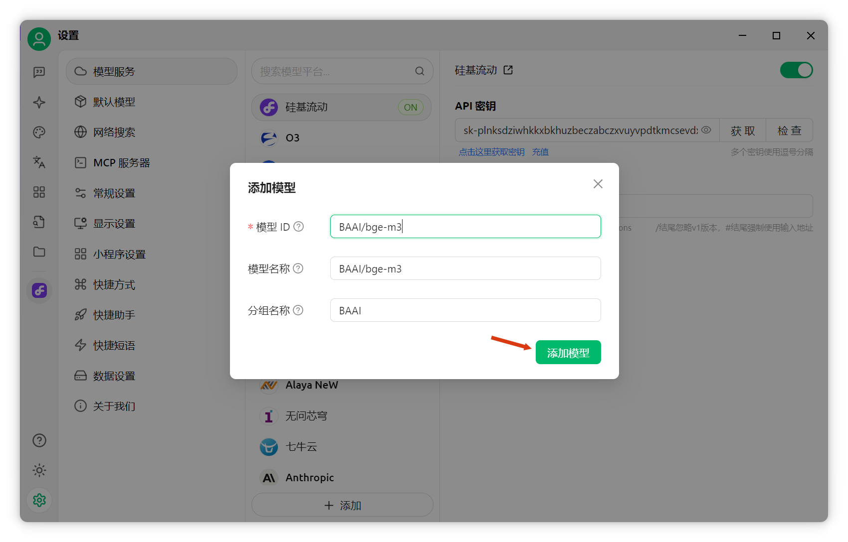本文以硅基流动提供的免费嵌入模型为例。找到“硅基流动”,点击获取密钥。若无账号可先注册。