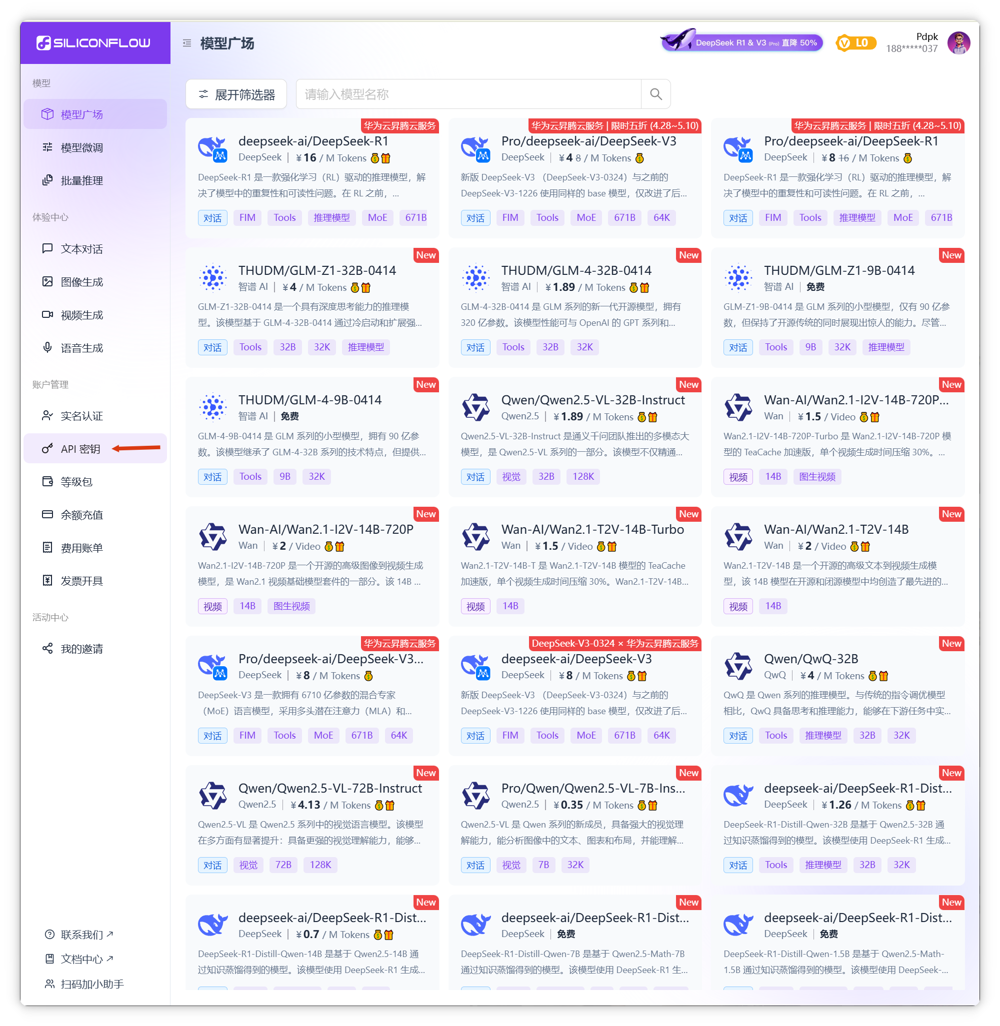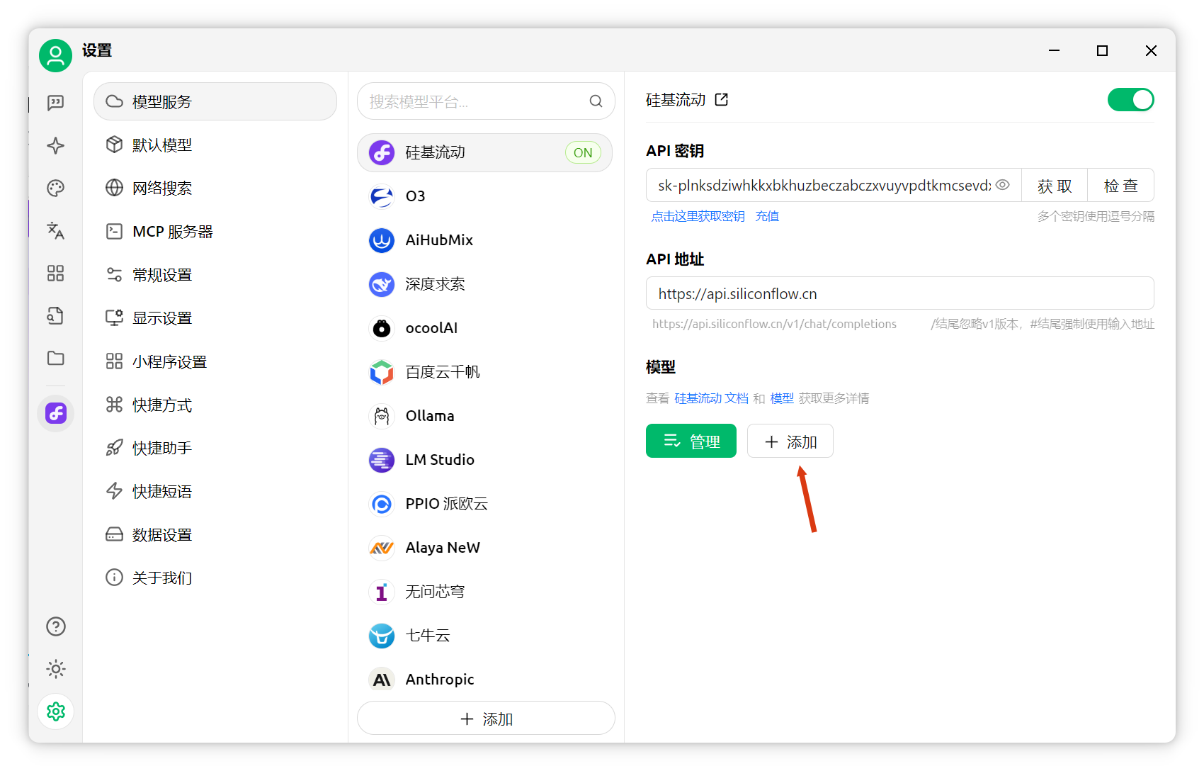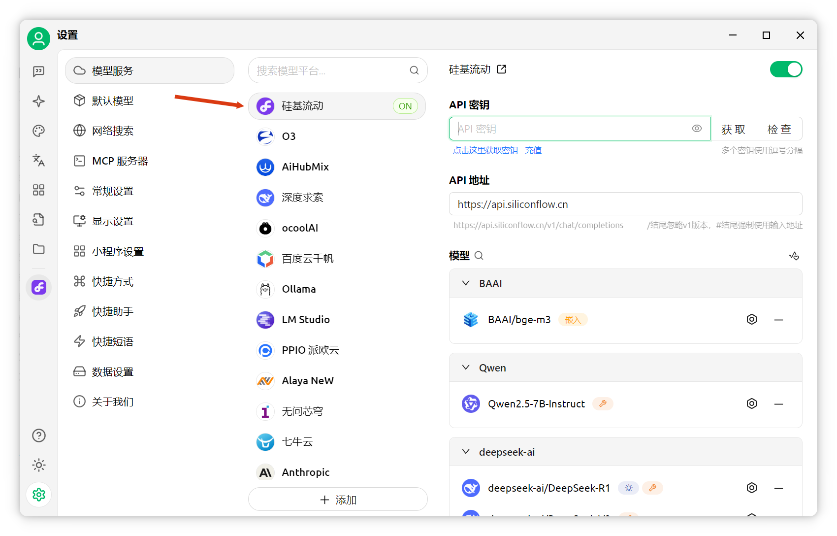 本文以硅基流动提供的免费嵌入模型为例。找到“硅基流动”,点击获取密钥。若无账号可先注册。