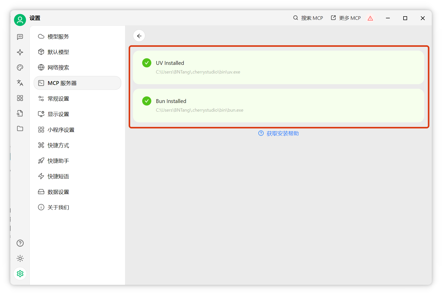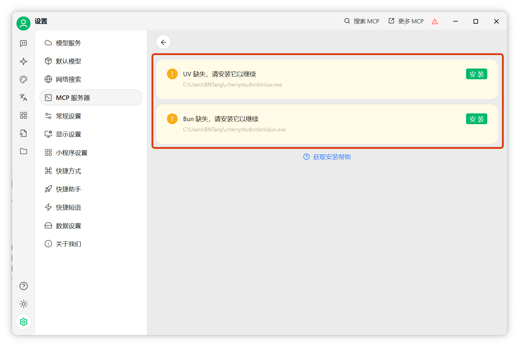 如出现红色感叹号,点击查看详情,按提示安装UV和Bun依赖。
