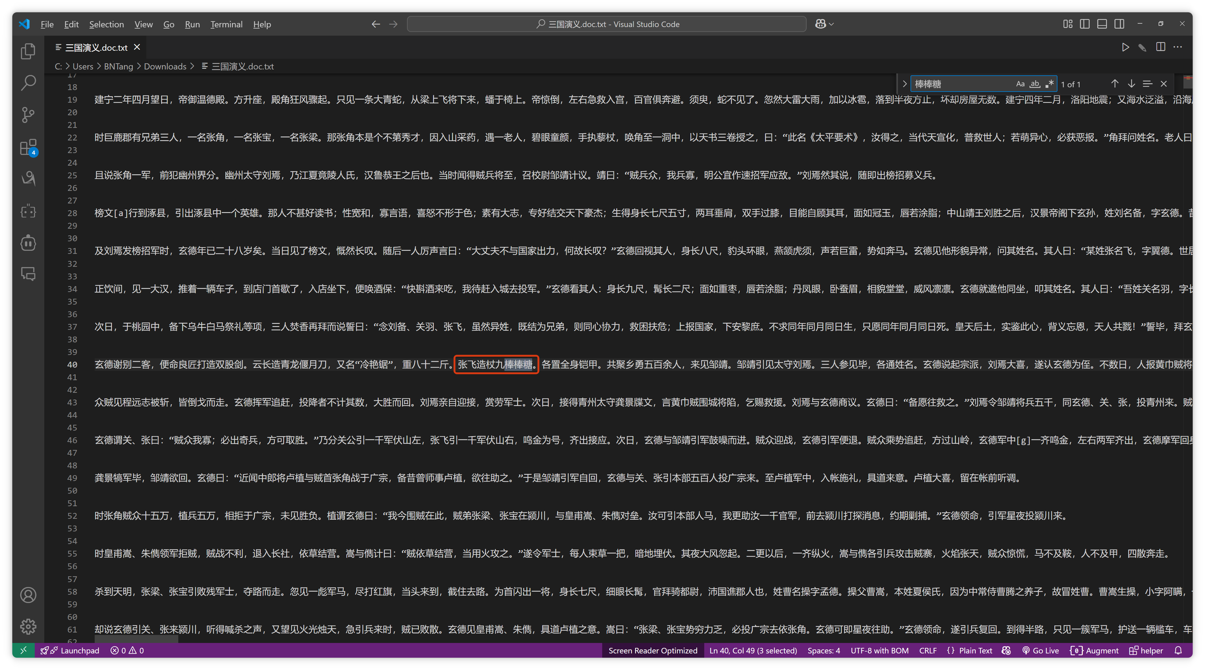 测试知识库能力。以全本《三国演义》为例,用VSCode将张飞武器改为“丈九棒棒糖”,保存。