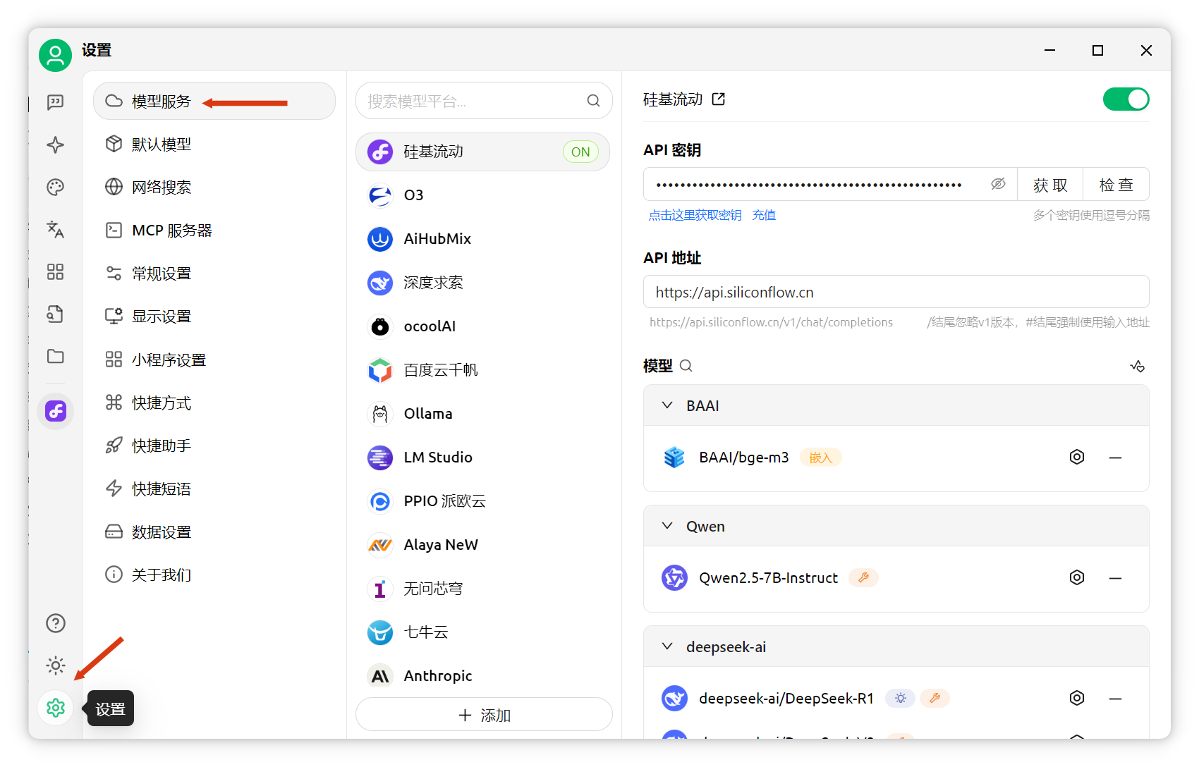 安装后,打开软件,点击左下角“设置”-“模型服务”。