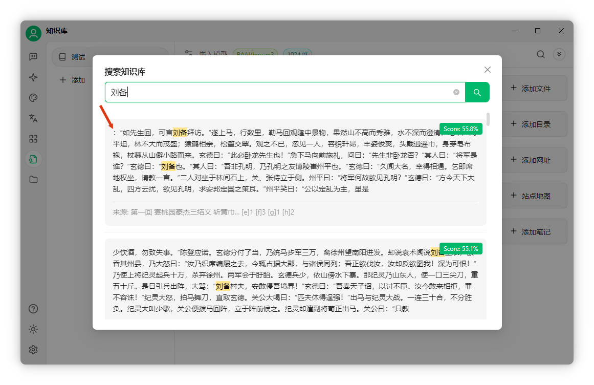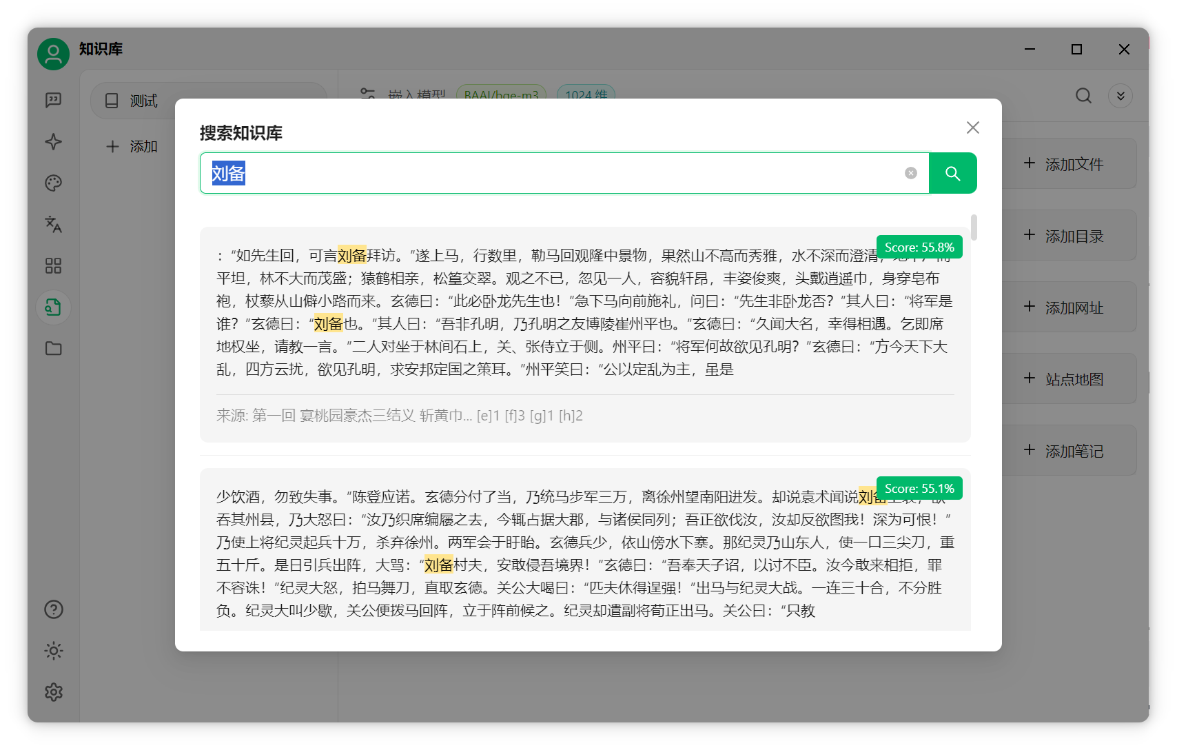 如搜索“刘备”,系统会基于向量匹配查找相关段落,每段约300字。