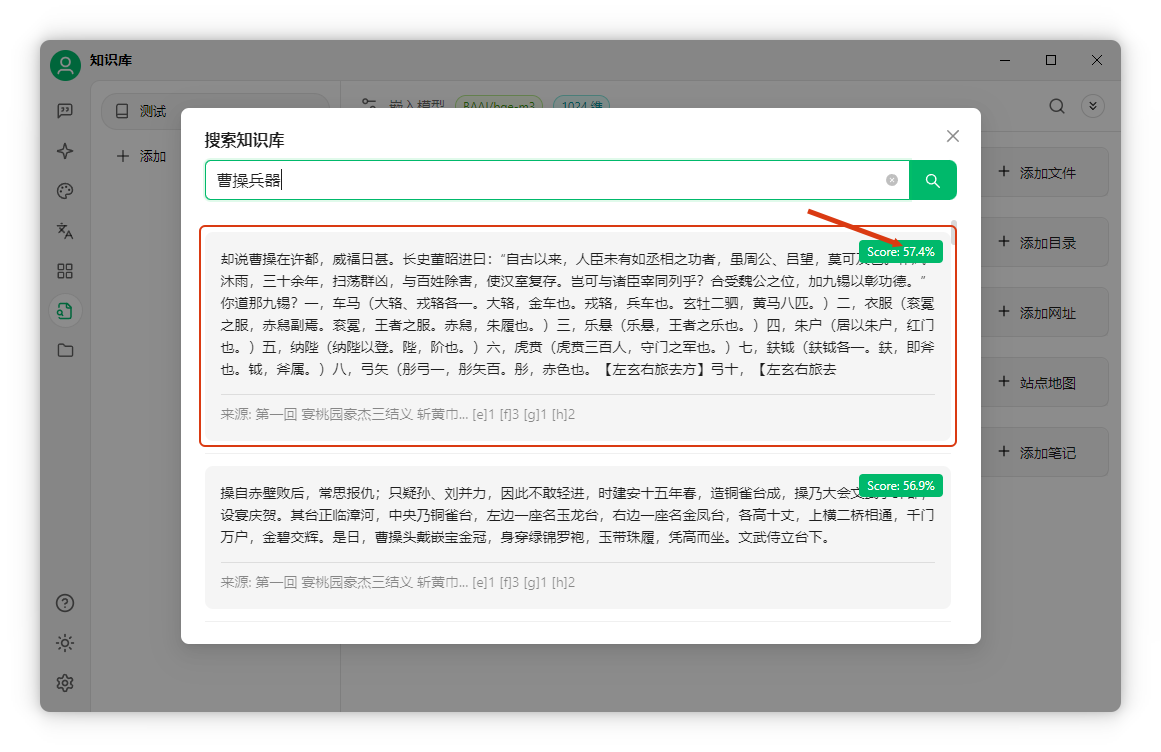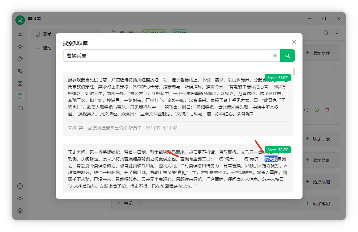 再次搜索“曹操兵器”,倚天剑信息排到第二位,分数78%。重排序模型显著提升了检索精度。