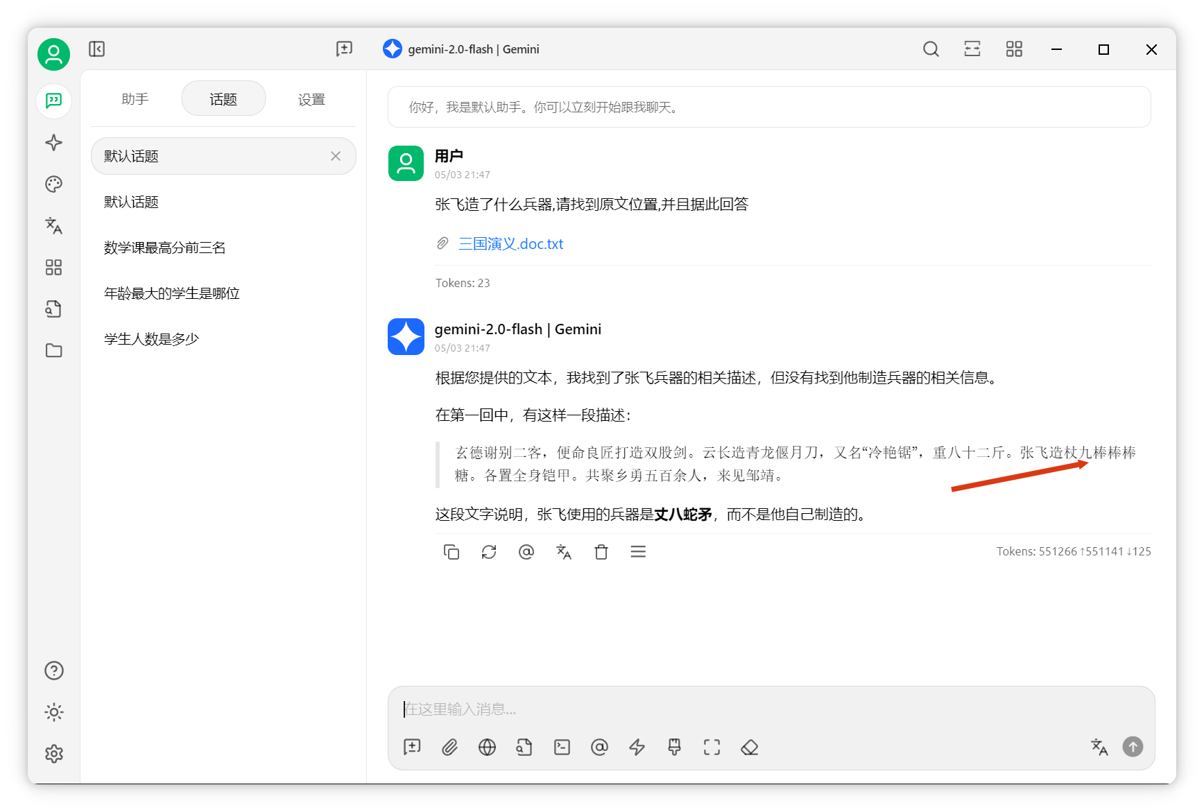 AI成功检索到答案,第一回中张飞造“丈九棒棒糖”。本次任务消耗551266 token。