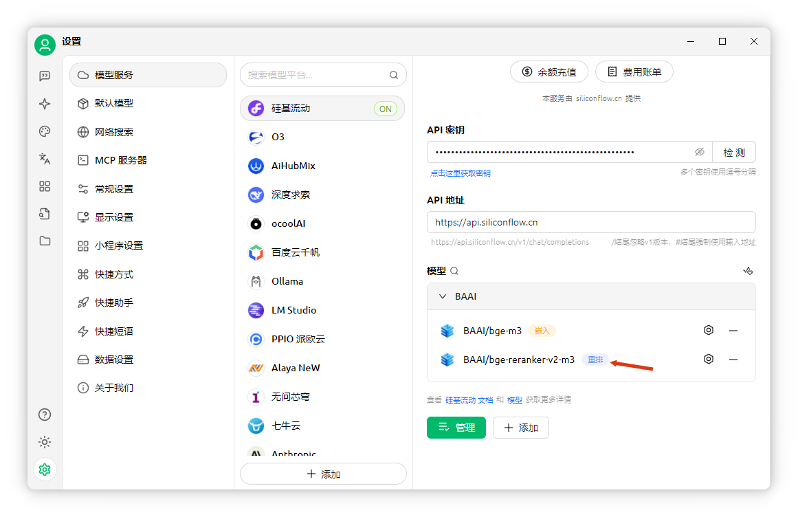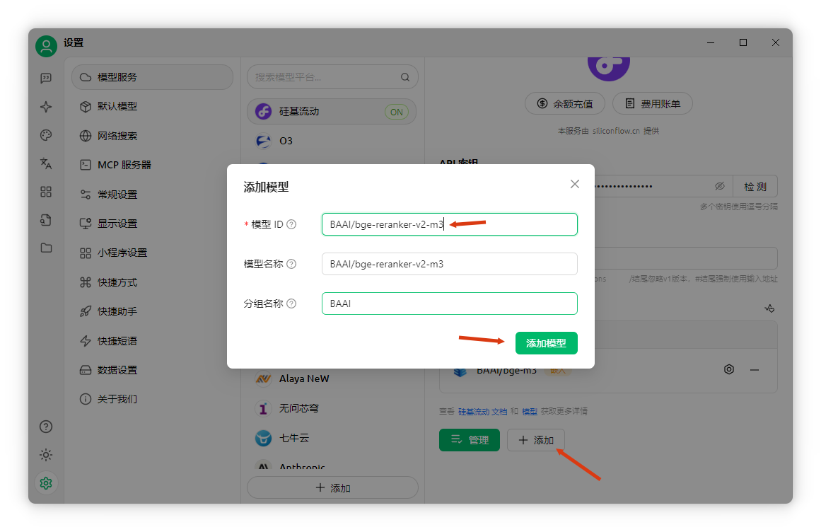 以“曹操兵器”为例,添加重排序模型后,效果明显提升。进入模型服务,找到硅基流动,添加重排序模型。