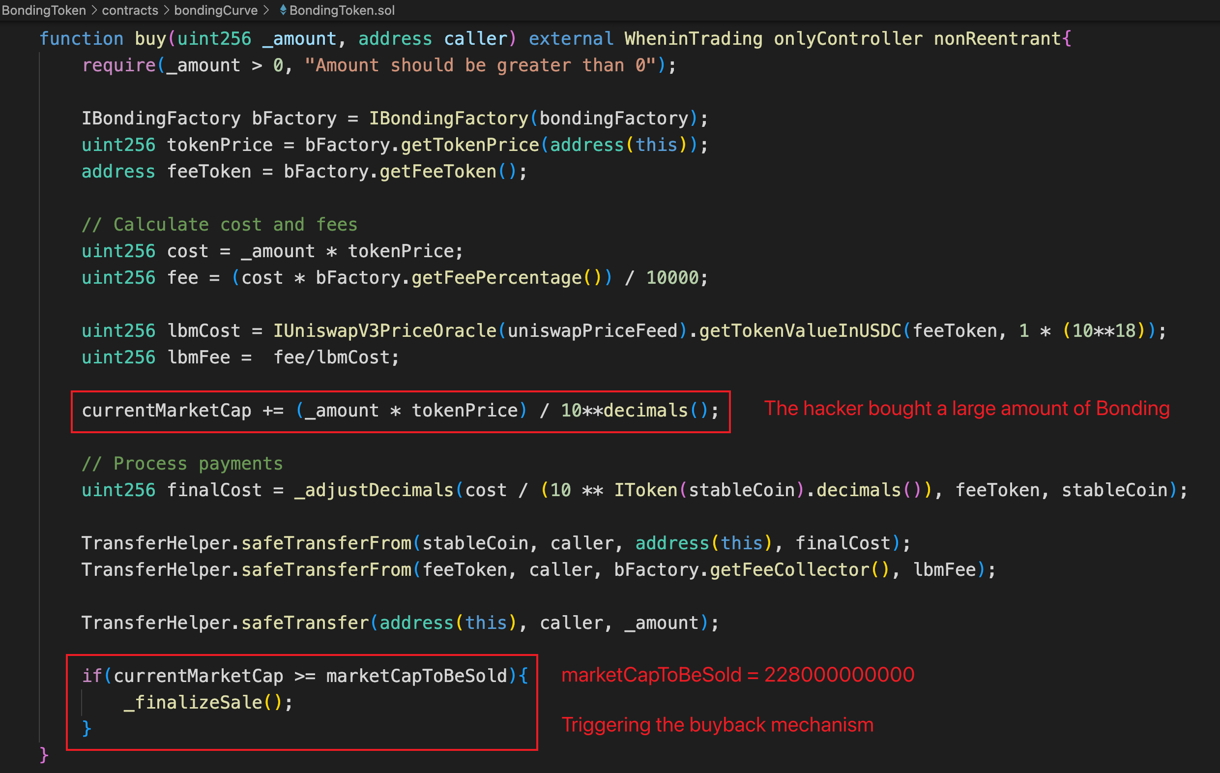 Bonding 和 LBM 组成一个双代币协议,LBM 作为 Bonding 的 feeToken。本次漏洞产生的原因主要在 Bonding 代币中。攻击者通过购入大量的 Bonding 代币触发回购机制。