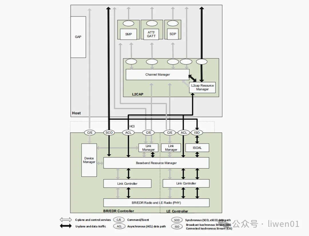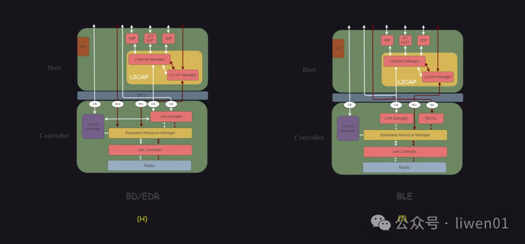 | Link Controller | 处理同步(SCO/eSCO)与异步(ACL)链路 | 处理 LE 连接和广播/扫描链路 |