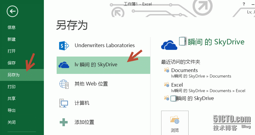 单击“文件”—“另存为”,然后选择“SkyDrive”。(由于我之前已经添加好了自己的SkyDrive帐户到这里,所以可以直接保存,如果在这个界面上没有这个选项,你需要选择“添加位置”将SkyDrive添加到这里来)