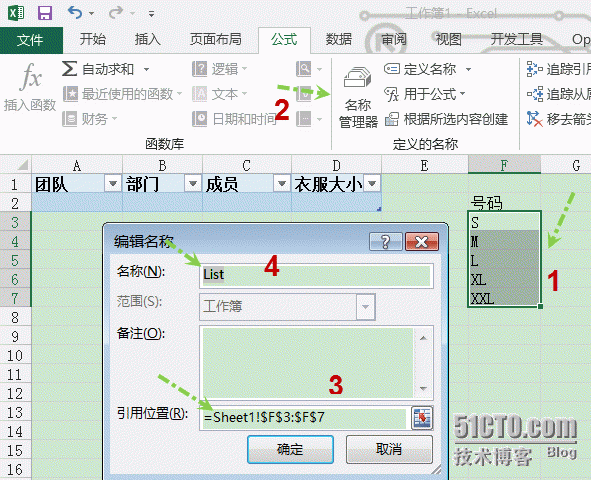 首先,我利用名称管理器定义“衣服大小”的列表,操作如下: