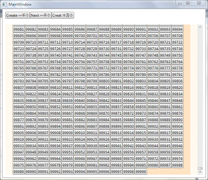 WPF界面,一次加载十万个按钮需要大概45S,程序完全卡住。分批加载是一个好方法。