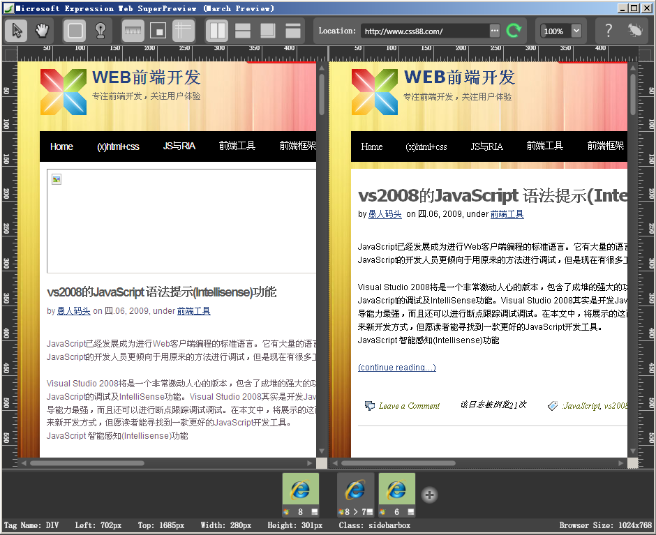 SuperPreview 是微软将推出的 Expression Web 3 的一部分,主要用于页面的调试,目前的 Expression Web SuperPreview 允许用户对比他们的站点在 IE 6 与 IE 7, IE 8 中的外观,而在将来的完整版中,还将支持 Firefox, Safari, Google Chrome(可能)以及更多浏览器.。