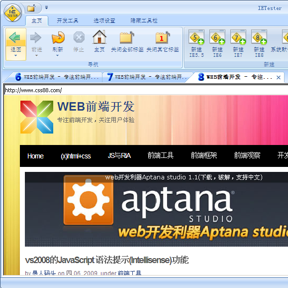使用IETester能够较好的解决,测试网页兼容性的多IE版本的需求。暂时已经支持IE5.5——IE8beta1,我想这已经足够了。还在苦苦找寻IE6和IE7共存或者IE7和IE8共存的朋友,可以试试这个软件。