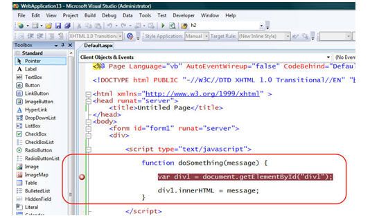 面对一大段的JavaScript脚本,以前总是会很头疼,找不到调试这些代码的方法。如果出现什么错误或异常,总是要从头分析,然后插入很多Alert(),调试起来很麻烦。Visual Studio 2008中JavaScript所具有的另外一个特性,是它提供了更加强大的JavaScript调试功能,这使得JavaScript的使用及构建AJAX应用都变得容易很多。同样,这项功能在免费的Visual Web Developer Express版本中和Visual Studio中都具有。