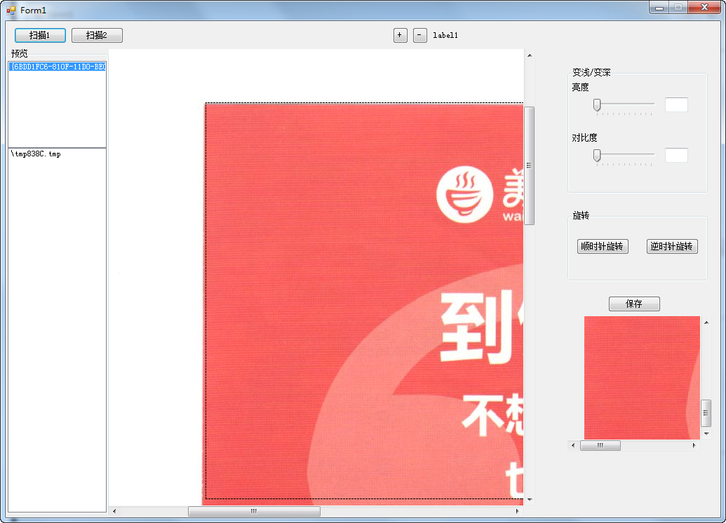 using System; using System.Collections.Generic; using System.ComponentModel; using System.Data; using System.Drawing; using System.Linq; using System.Text; using System.Windows.Forms; using WIA; using System.IO; using System.Drawing.Imaging; using iTextSharp; using iTextSharp.text; using iTextSharp.text.pdf; using System.Drawing.Drawing2D; namespace printTest { public partial class Form1 : Form { List<System.Drawing.Image> images = new List<System.Drawing.Image>(); public static List<string> GetDevices() { List<string> devices = new List<string>(); WIA.DeviceManager manager = new WIA.DeviceManager(); foreach (WIA.DeviceInfo info in manager.DeviceInfos) { devices.Add(info.DeviceID); } return devices; } const string wiaFormatBMP = "{B96B3CAB-0728-11D3-9D7B-0000F81EF32E}"; class WIA_DPS_DOCUMENT_HANDLING_SELECT { public const uint FEEDER = 0x00000001; public const uint FLATBED = 0x00000002; } class WIA_DPS_DOCUMENT_HANDLING_STATUS { public const uint FEED_READY = 0x00000001; } class WIA_PROPERTIES { public const uint WIA_RESERVED_FOR_NEW_PROPS = 1024; public const uint WIA_DIP_FIRST = 2; public const uint WIA_DPA_FIRST = WIA_DIP_FIRST + WIA_RESERVED_FOR_NEW_PROPS; public const uint WIA_DPC_FIRST = WIA_DPA_FIRST + WIA_RESERVED_FOR_NEW_PROPS; // // Scanner only device properties (DPS) // public const uint WIA_DPS_FIRST = WIA_DPC_FIRST + WIA_RESERVED_FOR_NEW_PROPS; public const uint WIA_DPS_DOCUMENT_HANDLING_STATUS = WIA_DPS_FIRST + 13; public const uint WIA_DPS_DOCUMENT_HANDLING_SELECT = WIA_DPS_FIRST + 14; } #region 画矩形使用到的变量 Point p1; //定义鼠标按下时的坐标点 Point p2; //定义移动鼠标时的坐标点 Point p3; //定义松开鼠标时的坐标点 #endregion #region 缩放、裁剪图像用到的变量 /// <summary> /// /// </summary> int x1; //鼠标按下时横坐标 int y1; //鼠标按下时纵坐标 int width; //所打开的图像的宽 int heigth; //所打开的图像的高 bool HeadImageBool = false; // 此布尔变量用来判断pictureBox1控件是否有图片 #endregion Bitmap Bi; //定义位图对像 public Form1() { InitializeComponent(); } #region 扫描1 private void btnScan_Click(object sender, EventArgs e) { listBox1.Items.Clear(); lbDevices.Items.Clear(); List<string> devices = GetDevices(); foreach (string device in devices) { lbDevices.Items.Add(device); } //check if device is not available if (lbDevices.Items.Count == 0) { MessageBox.Show("没有任何可用的打印、扫描设备!"); this.Close(); } else { lbDevices.SelectedIndex = 0; } bool hasMorePages = true; string deviceID = (string)lbDevices.SelectedItem; while (hasMorePages) { //select the correct scanner using the provided scannerId parameter WIA.DeviceManager manager = new WIA.DeviceManager(); WIA.Device device = null; foreach (WIA.DeviceInfo info in manager.DeviceInfos) { if (info.DeviceID == deviceID) { // connect to scanner device = info.Connect(); break; } } // device was not found if (device == null) { // enumerate available devices string availableDevices = ""; foreach (WIA.DeviceInfo info in manager.DeviceInfos) { availableDevices += info.DeviceID + "\n"; } // show error with available devices throw new Exception("The device with provided ID could not be found. Available Devices:\n" + availableDevices); } int i = device.Items.Count; WIA.Item item = device.Items[1] as WIA.Item; try { // scan image WIA.ICommonDialog wiaCommonDialog = new WIA.CommonDialog(); WIA.ImageFile image = (WIA.ImageFile)wiaCommonDialog.ShowTransfer(item, wiaFormatBMP, false); // save to temp file string fileName = Path.GetTempFileName(); File.Delete(fileName); image.SaveFile(fileName);//保存temp文件 image = null; int leng = @"C:\Users\ll\AppData\Local\Temp".Length; // add file to output list listBox1.Items.Add(fileName.Substring(leng, fileName.Length - leng)); //listBox1.Items.Add(fileName); images.Add(System.Drawing.Image.FromFile(fileName));//C:\Users\ll\AppData\Local\Temp } catch (Exception exc) { //MessageBox.Show(exc.Message); } finally { item = null; //determine if there are any more pages waiting WIA.Property documentHandlingSelect = null; WIA.Property documentHandlingStatus = null; foreach (WIA.Property prop in device.Properties) { if (prop.PropertyID == WIA_PROPERTIES.WIA_DPS_DOCUMENT_HANDLING_SELECT) documentHandlingSelect = prop; if (prop.PropertyID == WIA_PROPERTIES.WIA_DPS_DOCUMENT_HANDLING_STATUS) documentHandlingStatus = prop; } // assume there are no more pages hasMorePages = false; // may not exist on flatbed scanner but required for feeder if (documentHandlingSelect != null) { // check for document feeder if ((Convert.ToUInt32(documentHandlingSelect.get_Value()) & WIA_DPS_DOCUMENT_HANDLING_SELECT.FEEDER) != 0) { hasMorePages = ((Convert.ToUInt32(documentHandlingStatus.get_Value()) & WIA_DPS_DOCUMENT_HANDLING_STATUS.FEED_READY) != 0); } } } } if (images.Count >= 0) { pictureBox1.Image = images[0]; double imageX = pictureBox1.Image.Width; double imageY = pictureBox1.Image.Height; double picX = pictureBox1.Width; double pixY = pictureBox1.Height; //pictureBox2.Image = images[0]; //pictureBox1.SizeMode = System.Windows.Forms.PictureBoxSizeMode.Zoom; } } #endregion #region 保存 private void button1_Click(object sender, EventArgs e) { if (pictureBox2.Image != null) { string where = @"E:\" + DateTime.Now.ToString("yyyy-MM-dd HHmmss"); //save scanned image into specific folder pictureBox2.Image.Save(where + ".jpeg", ImageFormat.Jpeg); // //iTextSharp.text.Rectangle pageSize = new iTextSharp.text.Rectangle(216f, 716f); // iTextSharp.text.Rectangle pageSize = new iTextSharp.text.Rectangle(216f, 716f); // pageSize.BackgroundColor = new iTextSharp.text.BaseColor(0xFF, 0xFF, 0xDE); // iTextSharp.text.Image img1 = iTextSharp.text.Image.GetInstance(pictureBox1.Image, iTextSharp.text.BaseColor.WHITE); // //设置边界 // //Document document = new Document(pageSize, 36f, 72f, 108f, 180f); // Document document = new Document(pageSize, 36f, 72f, 108f, 180f); // PdfWriter.GetInstance(document, new