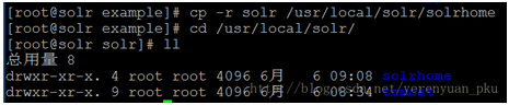 紧接着将solr-4.10.3/example目录下的solr文件夹复制到/usr/local/solr/目录下并且重命名为solrhome,如此一来,/usr/local/solr/目录下面就会有solrhome和tomcat这两个目录了,如下图所示。