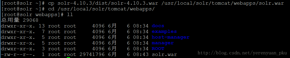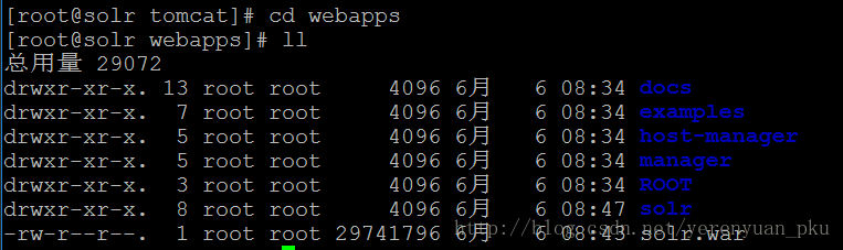 我们将Solr的war包放到tomcat的webapps目录下并命名为solr.war,如下图所示,进入/usr/local/solr/tomcat/webapps目录之后即可看到solr.war包。
