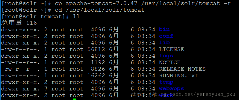 然后我们将解压好的的apache-tomcat-7.0.47目录复制一份到/usr/local/solr/目录下并重命名为tomcat,如下图所示,进入/usr/local/solr/tomcat目录之后即可看到我们非常熟悉的东西了。