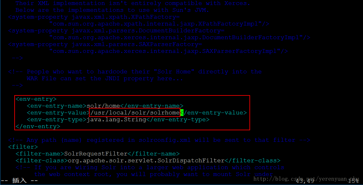 下面我们需要修改/usr/local/solr/tomcat/webapps/solr/WEB-INF目录下的web.xml文件,我们要把web.xml文件当中用红框标注的这段配置的注释去掉,并修改<env-entry-value>的值为我们solrhome的目录,如下图所示。