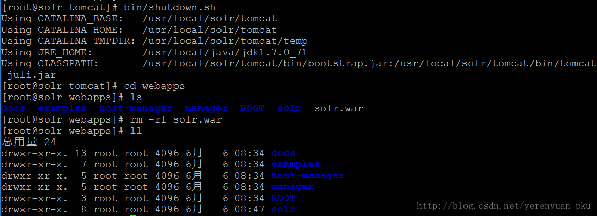 下面我们删掉webapps目录下的solr.war,但是前提是先关闭掉tomcat,然后再删除(如果不关闭tomcat就删除solr.war的话,solr文件夹也会被删除),如下图所示。