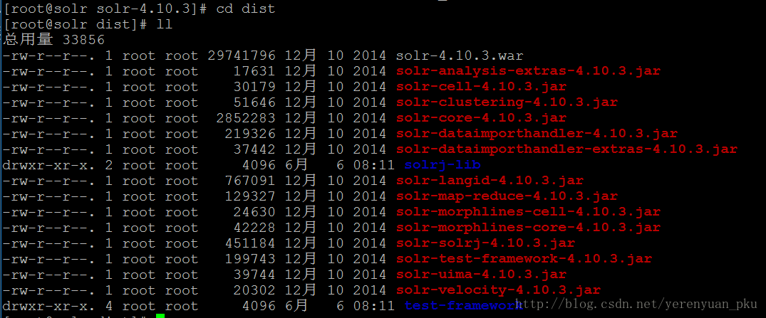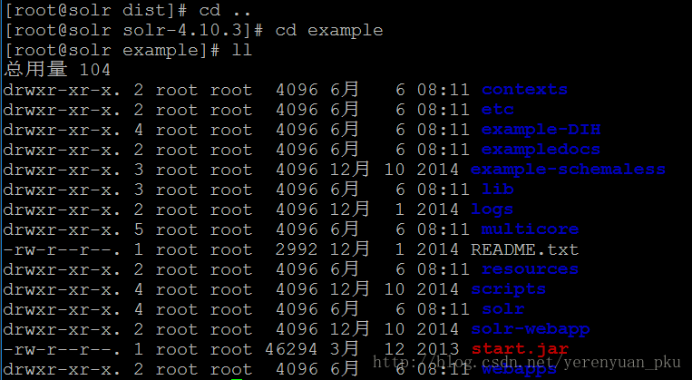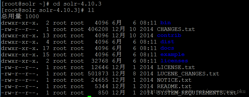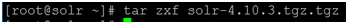 使用tar zxf solr-4.10.3.tgz.tgz命令将Solr的压缩包解压缩到用户主目录(即root)下。