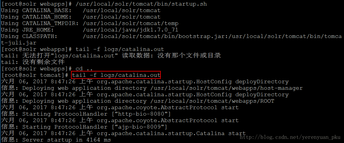 下面对solr.war进行解压,解压的方式是启动tomcat,并且可以是使用tail -f logs/catalina.out命令查看启动日志,如下图所示。