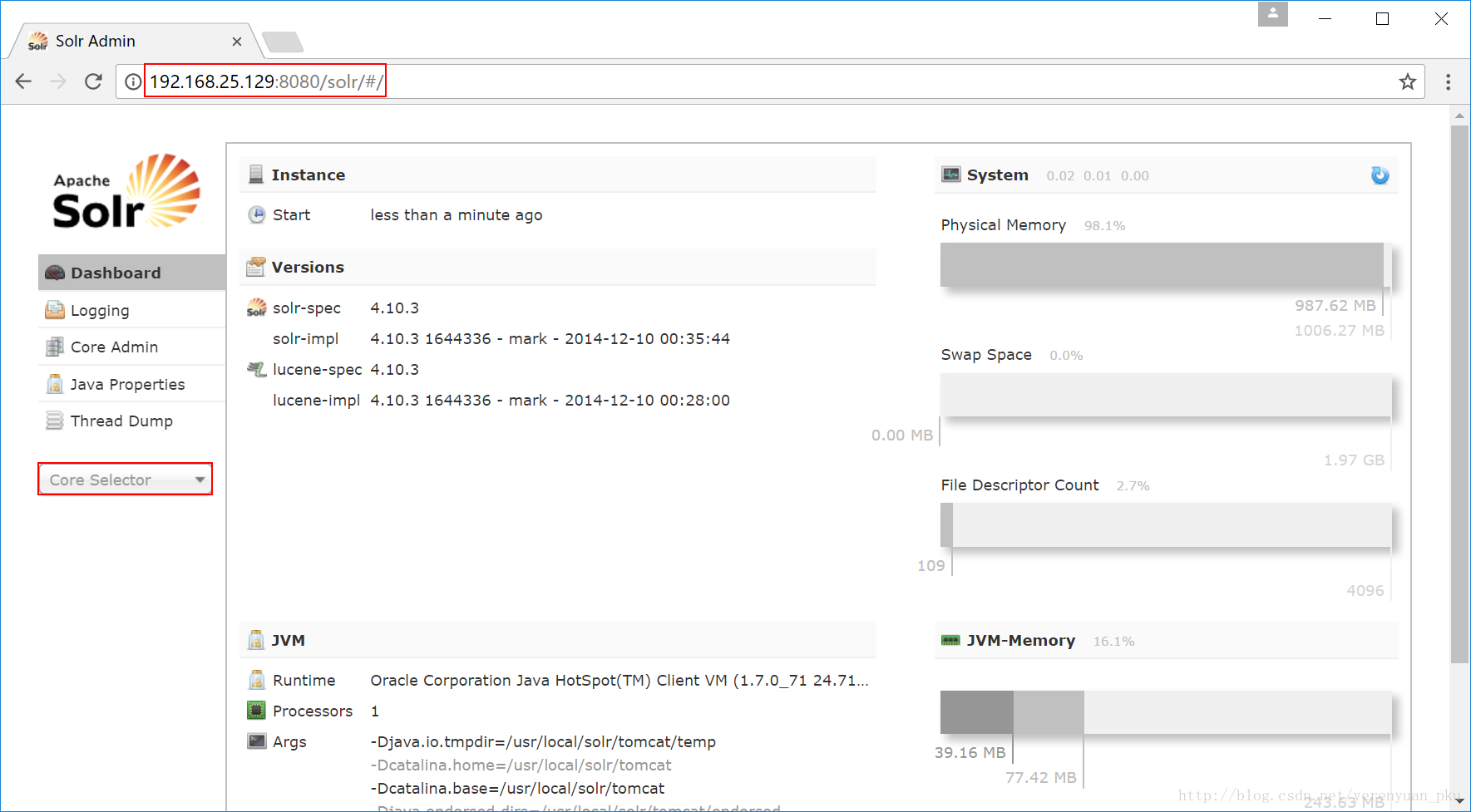 接下来,我们到浏览器地址栏中输入http://虚拟机ip地址:8080/solr/即可访问到Solr的管理页面了,如下图所示。