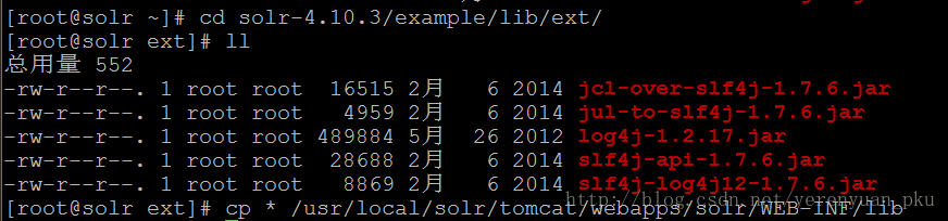 下面我们将solr-4.10.3/example/lib/ext/目录下的所有jar包拷贝到/usr/local/solr/tomcat/webapps/solr/WEB-INF/lib目录中,如下图所示。