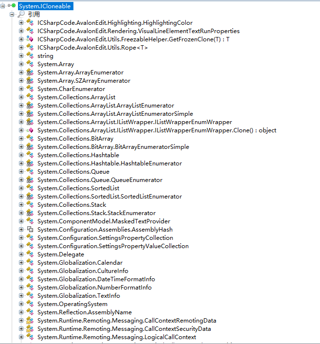 在.NET中,微软已经为我们提供了原型模式的接口实现,该接口就是ICloneable,其实这个接口就是抽象原型,提供克隆方法,相当于与上面代码中Prototype抽象类,其中的Clone()方法来实现原型模式,如果我们想我们自定义的类具有克隆的功能,首先定义类实现ICloneable接口的Clone方法。其实在.NET中实现了ICloneable接口的类有很多,如下图所示(图中只截取了部分,可以用ILSpy反编译工具进行查看):