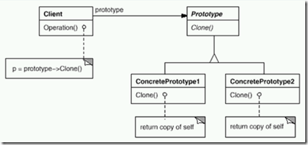 在原型模式中,Prototype通常提供一个包含Clone方法的接口,具体的原型ConcretePrototype使用Clone方法完成对象的创建。