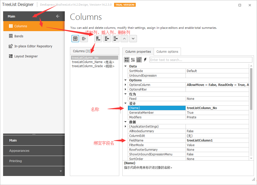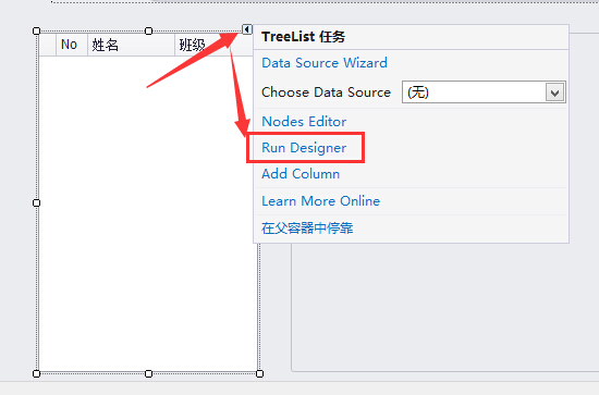 拖拽一个TreeList到窗体中,然后点击右上角菜单-选择Run Designer,然后打开TreeList的设计器,我们先添加如图三列: