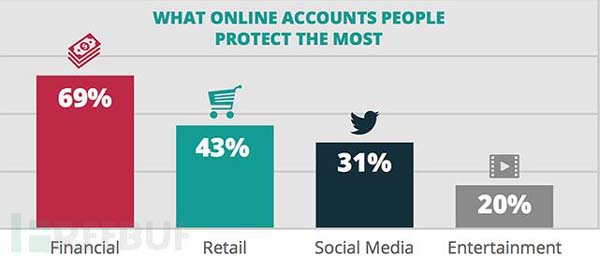 用户对密码安全性的重视度:银行账户等财务相关(69%)>网购(43%)>社交媒体(31%)>娱乐(20%)。